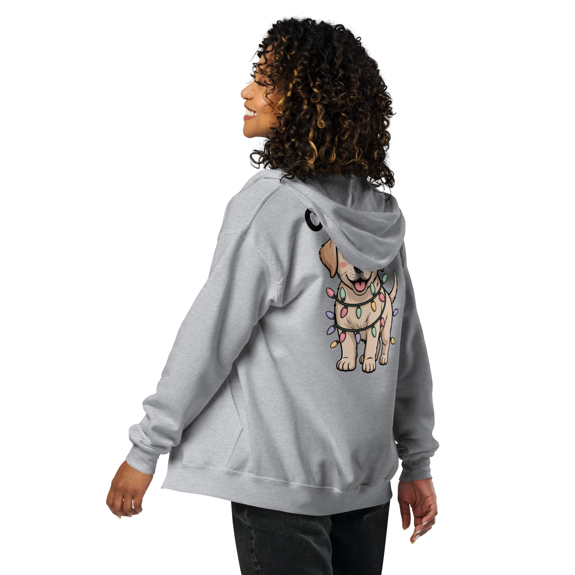 Get ready for the holidays in this cozy and fun zip-up hoodie! The adorable “All Lit Up for Christmas” graphic, featuring a cheerful puppy tangled in lights, is prominently displayed on the back. It’s the perfect heavy layer for all your winter and holiday activities, keeping you warm while spreading some festive cheer and puppy love.