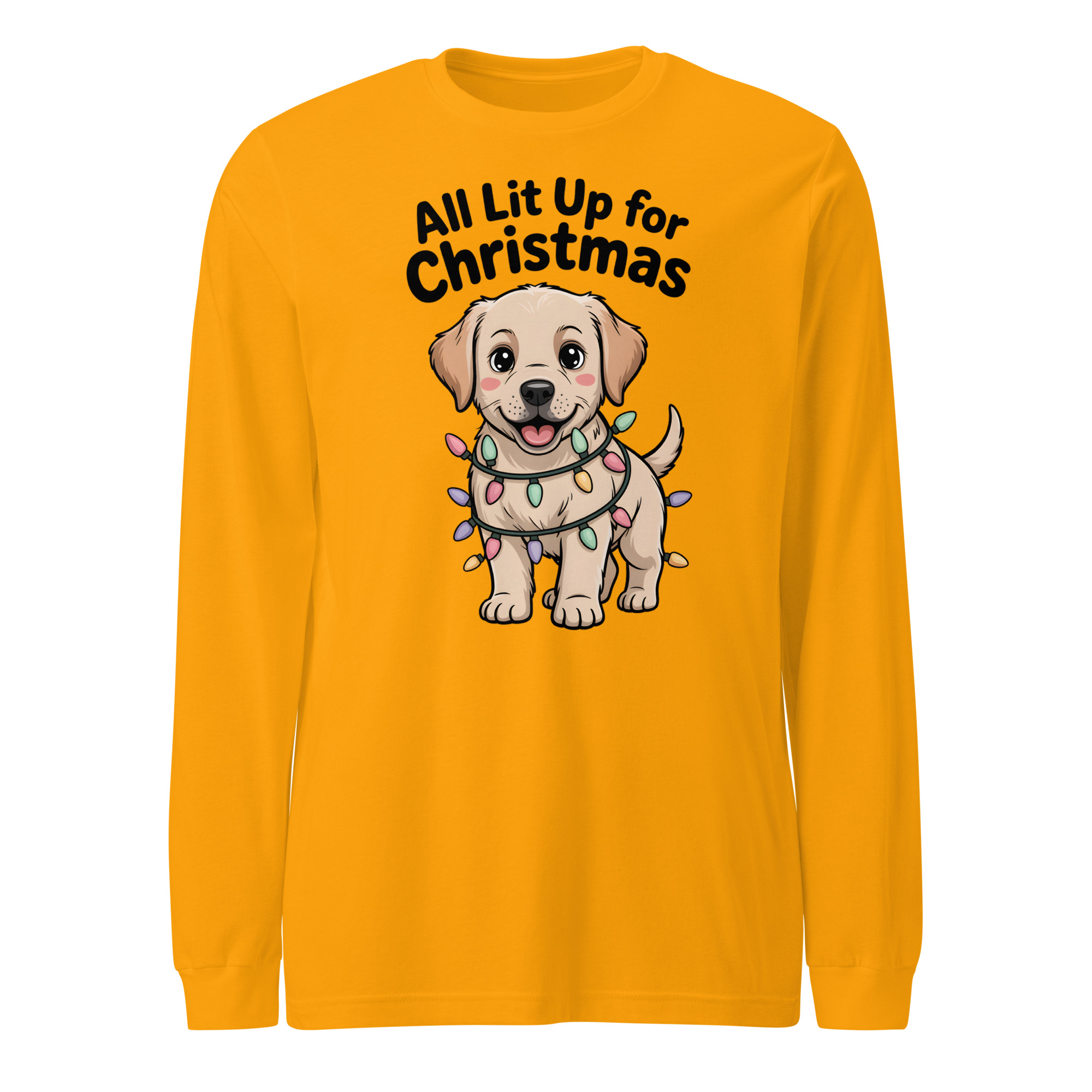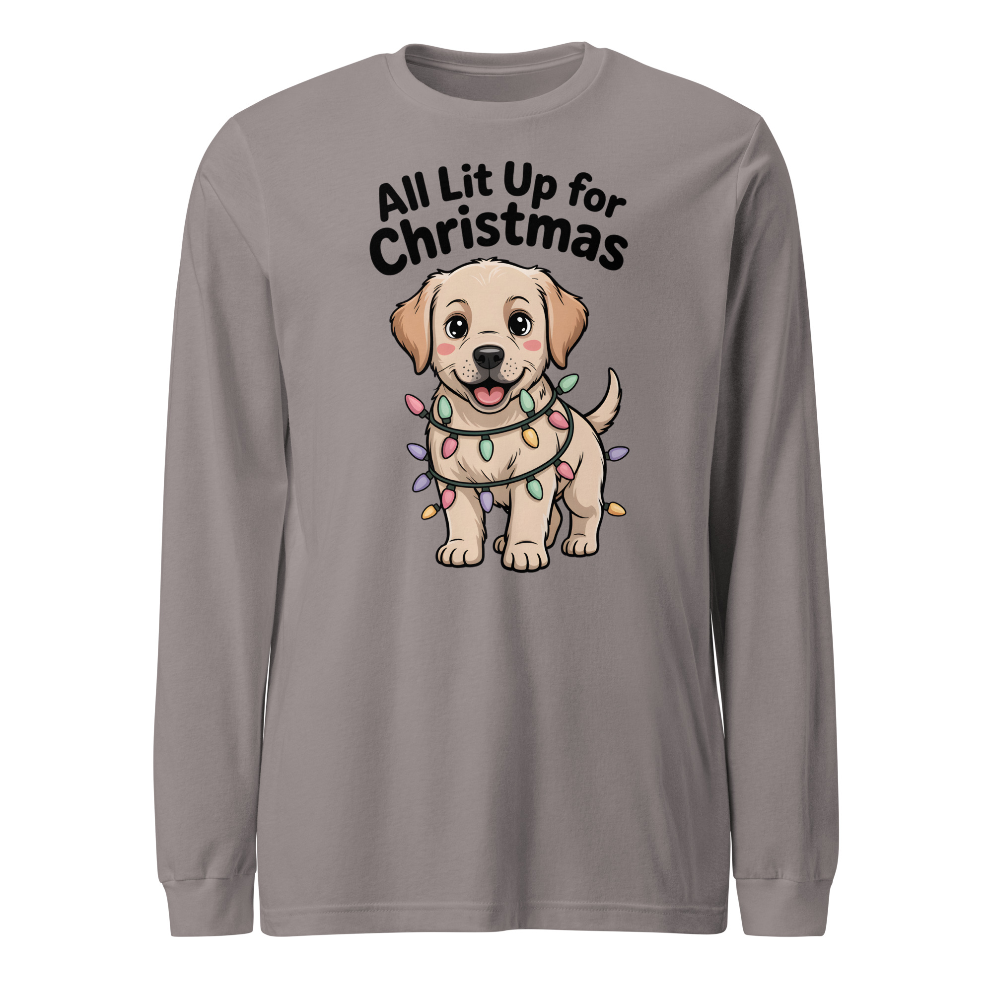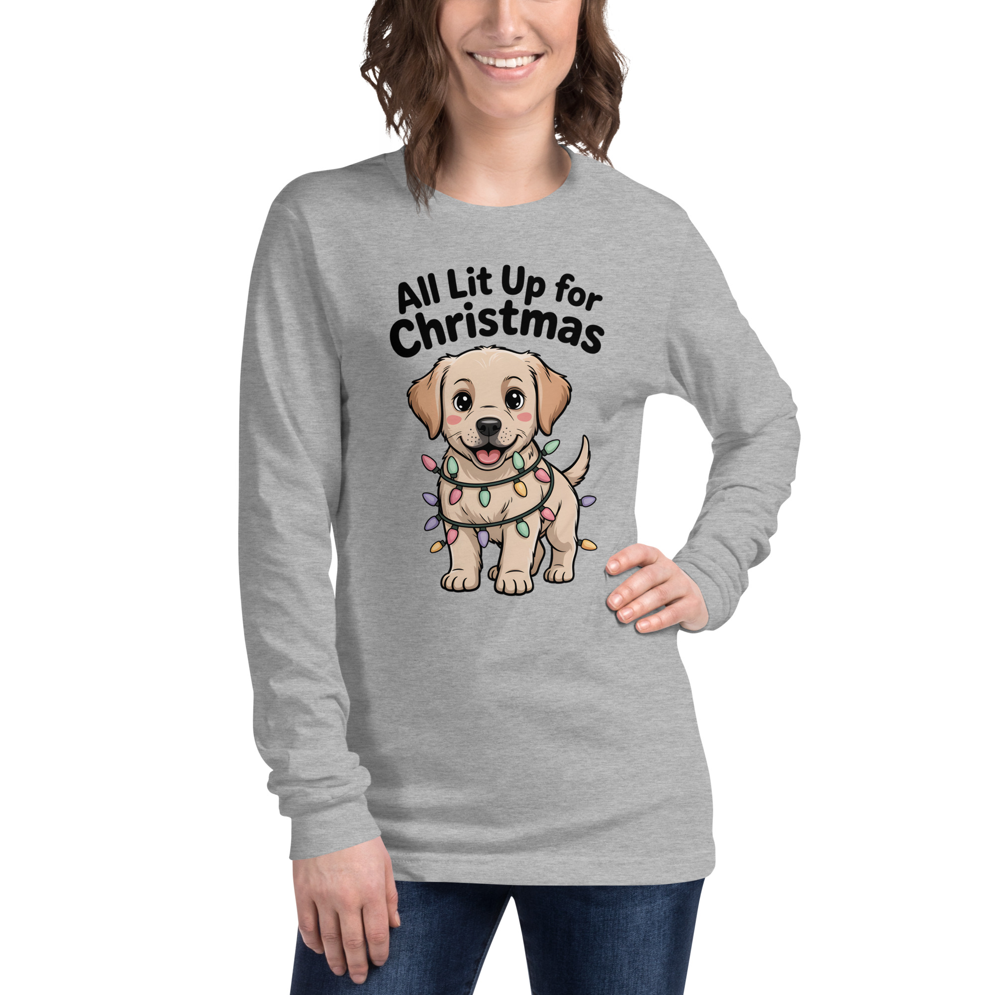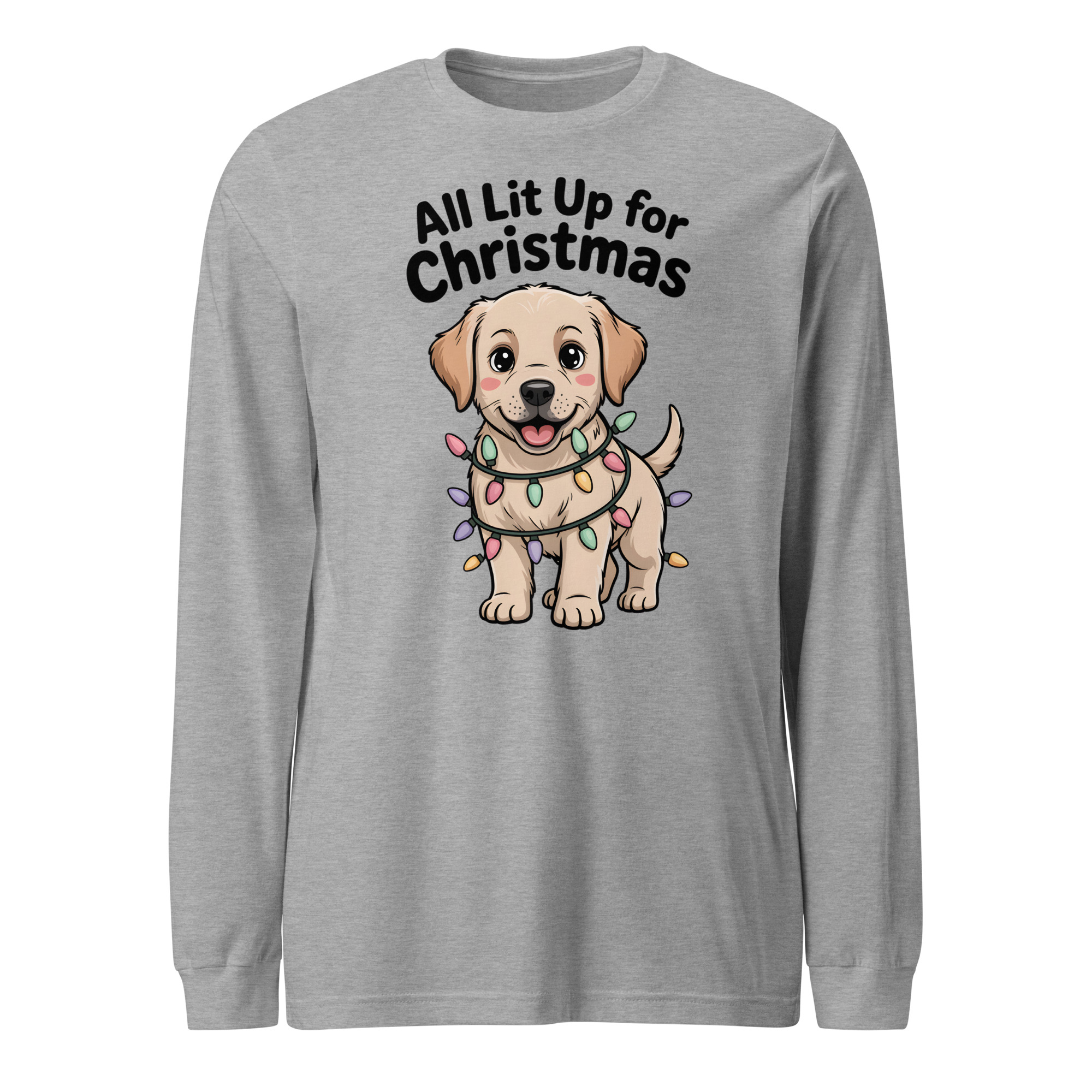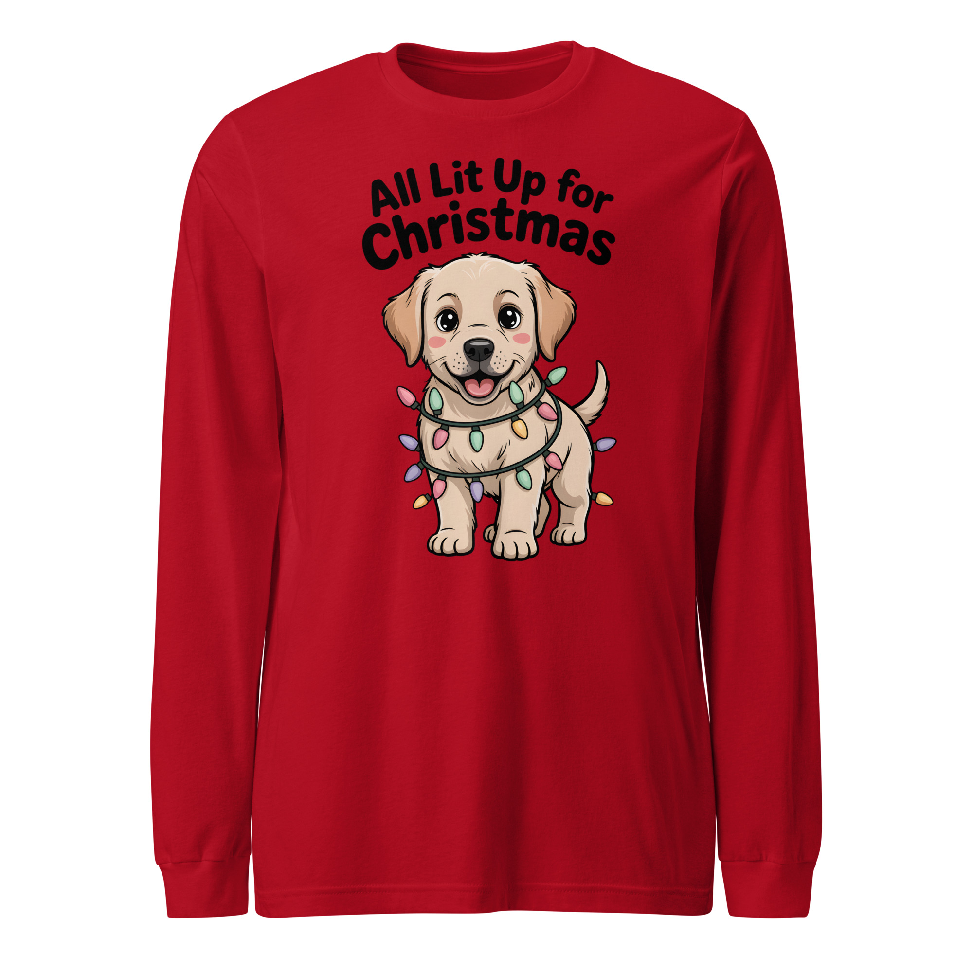 Get ready for the holiday season with this soft and charming Unisex Long Sleeve Tee! Featuring a cheerful puppy adorably tangled in colorful Christmas lights and the witty phrase “All Lit Up for Christmas,” this shirt is perfect for all your cold-weather activities. It’s an ideal choice for a casual look, comfortable for wearing on its own, or layering under a jacket during the holidays.