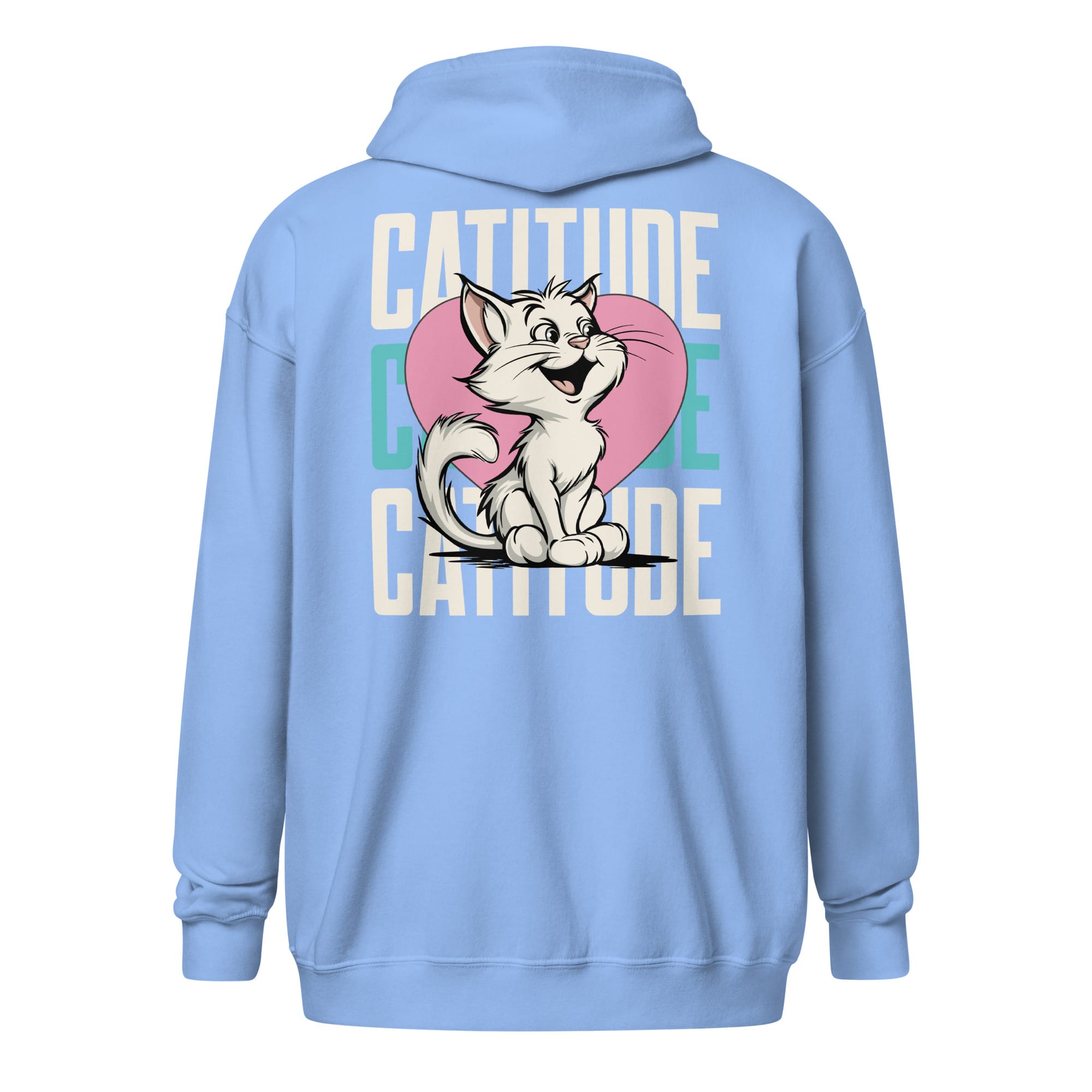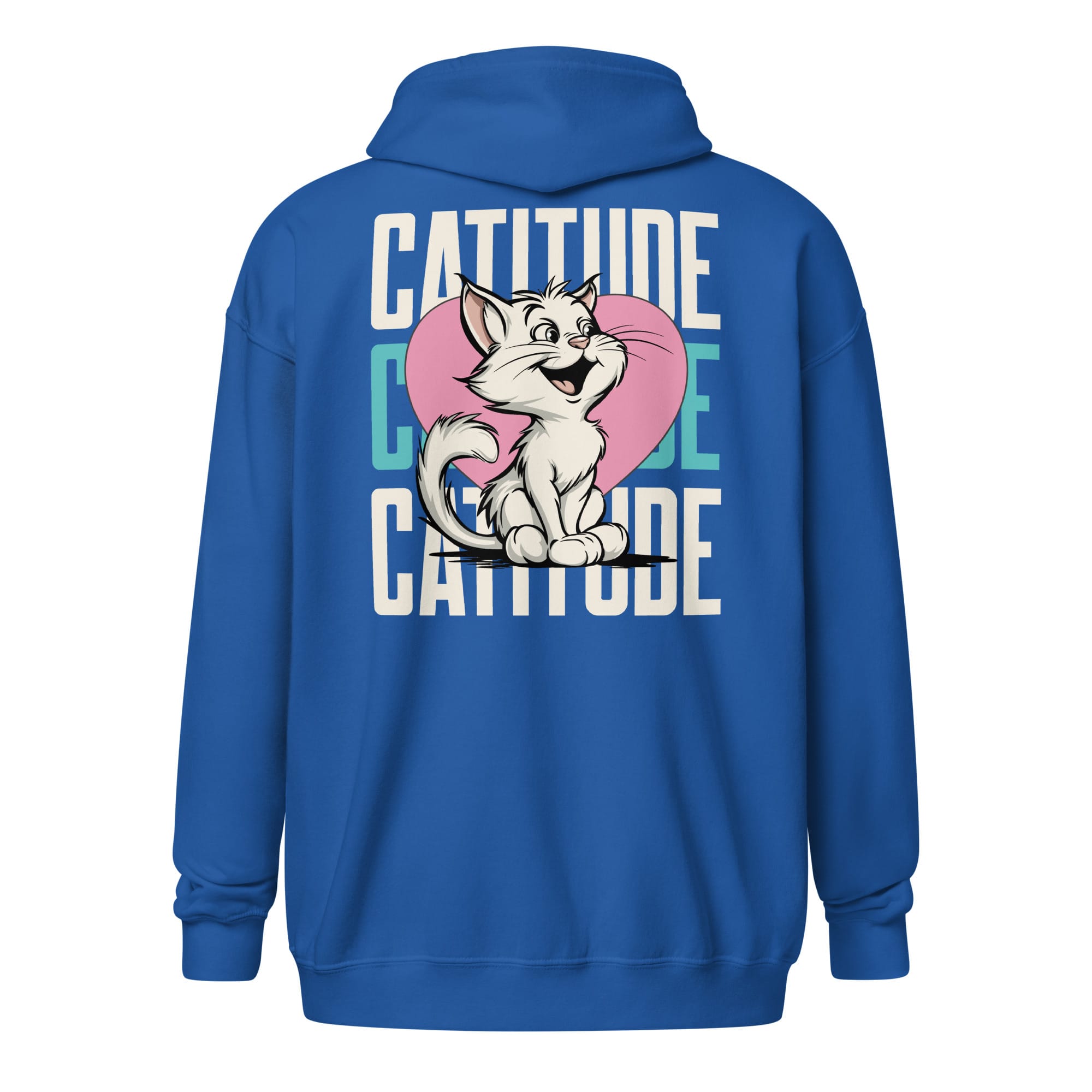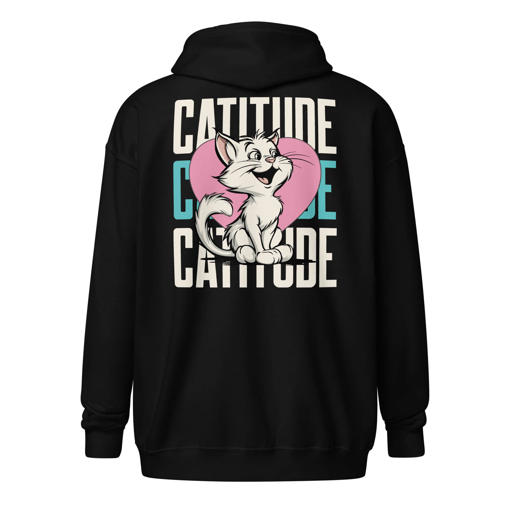 Show off your feline love and sass with this incredibly cozy and functional zip-up hoodie! The clever “CATITUDE” slogan and the charming, smiling kitten are proudly displayed on the back, making a fun statement as you go about your day. It’s the perfect heavy layer for any cat mom or cat dad who wants to stay warm and show off that unique cat attitude.