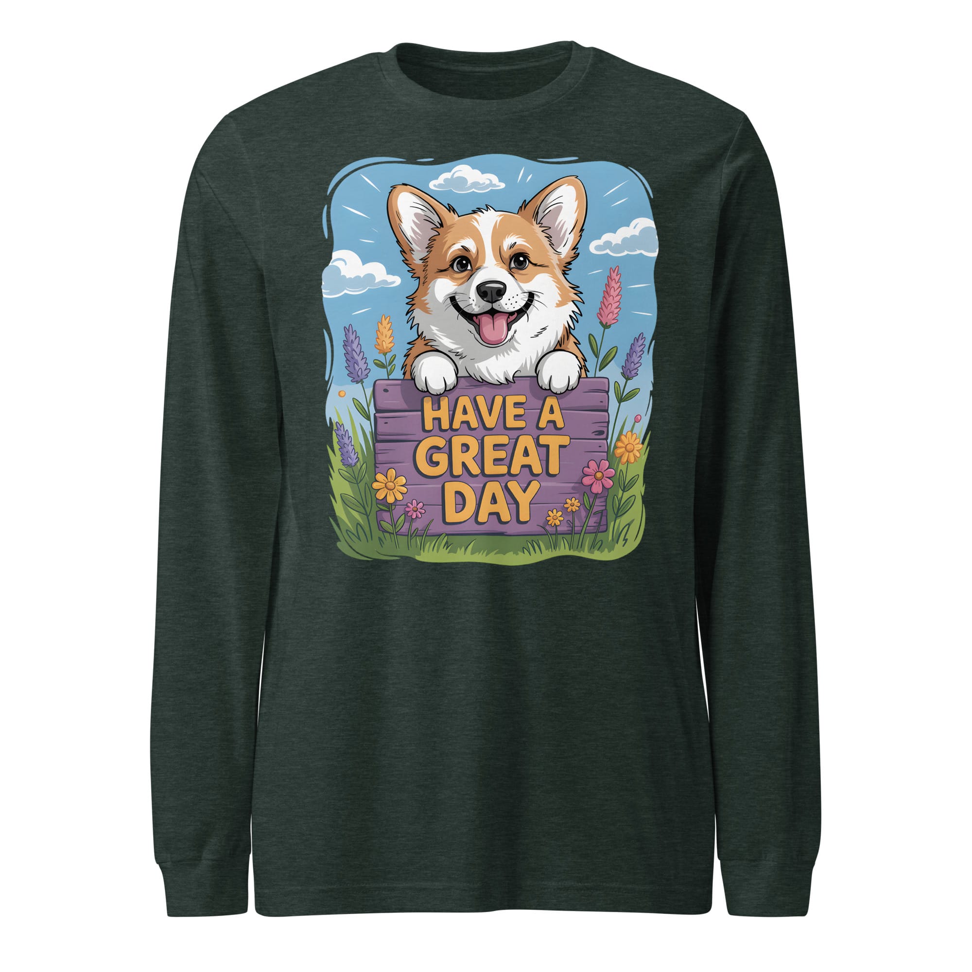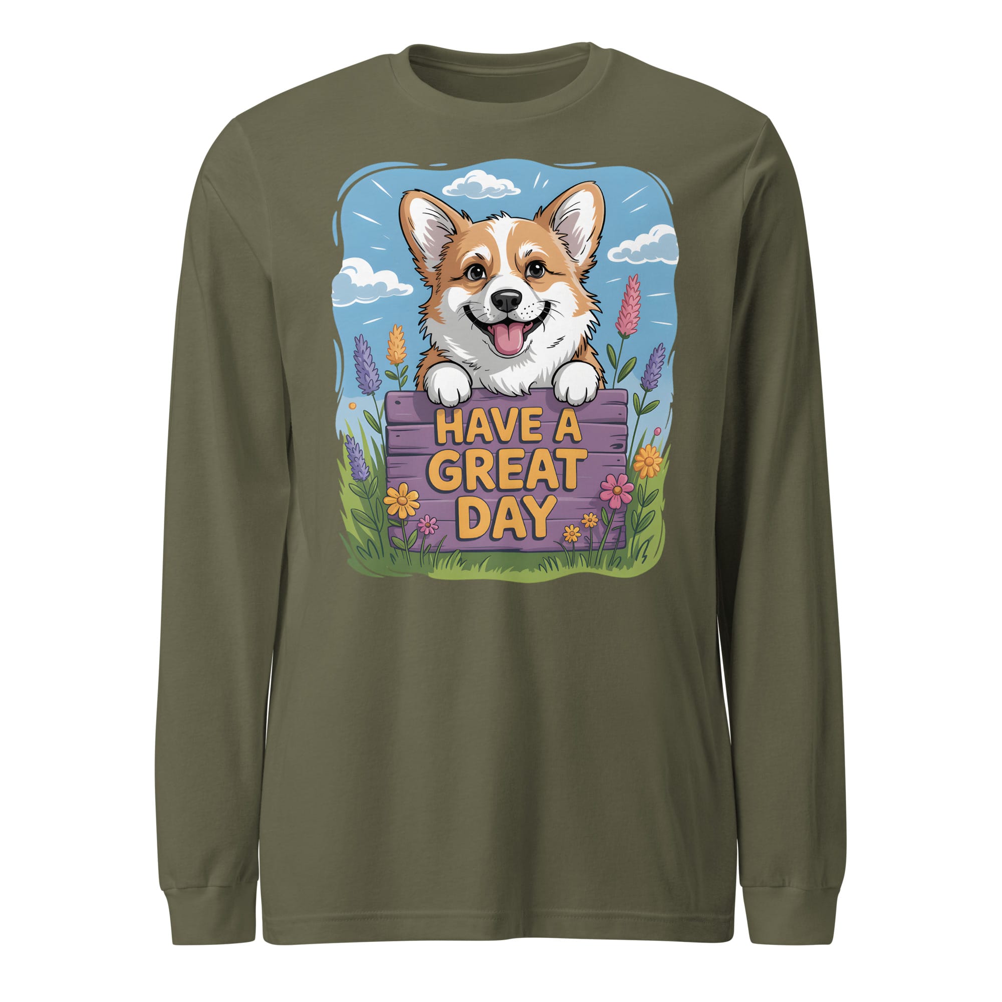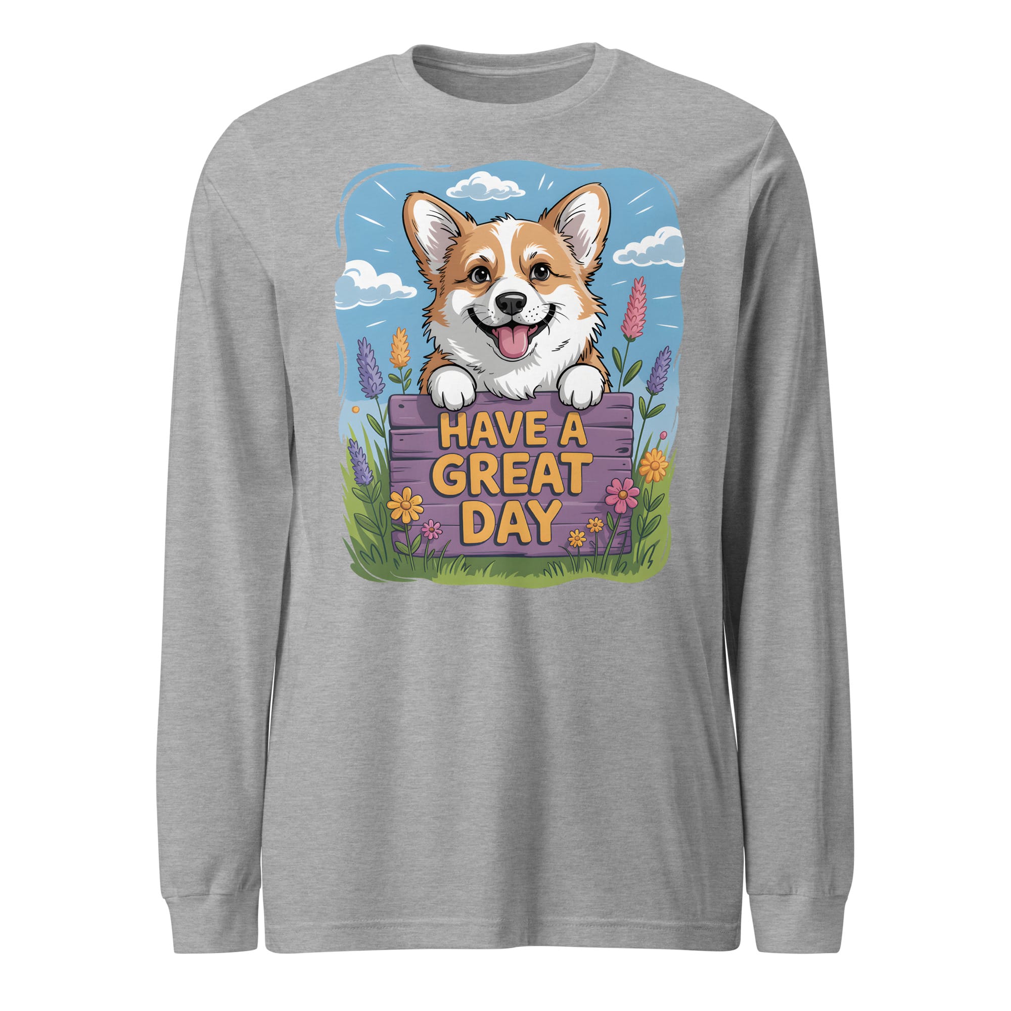 Brighten your wardrobe with this charming Unisex Long Sleeve Tee! If you are searching for a thoughtful gift for Corgi lovers or a cozy addition to your own collection, this shirt is the perfect choice. It features a carefully crafted illustration of a cheerful Corgi peeking over a floral fence with the uplifting message “HAVE A GREAT DAY.” This original design is a heartwarming option for all pet parents who want a comfortable layer and a touch of positive vibes.