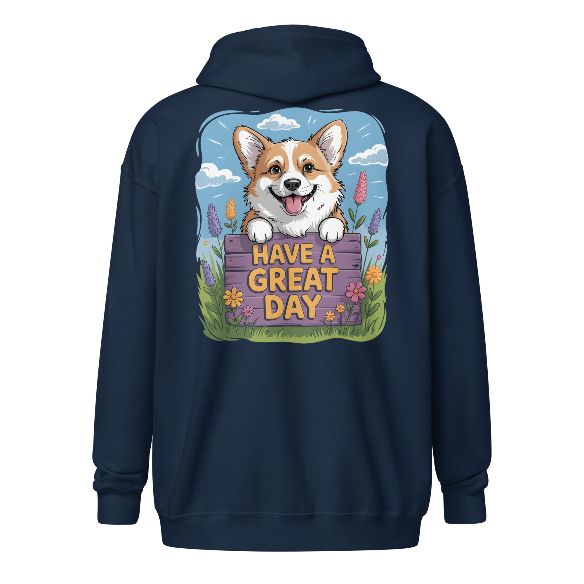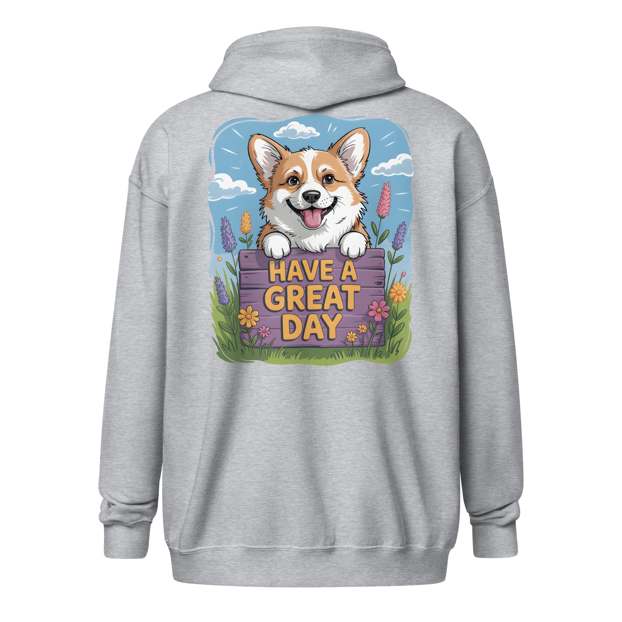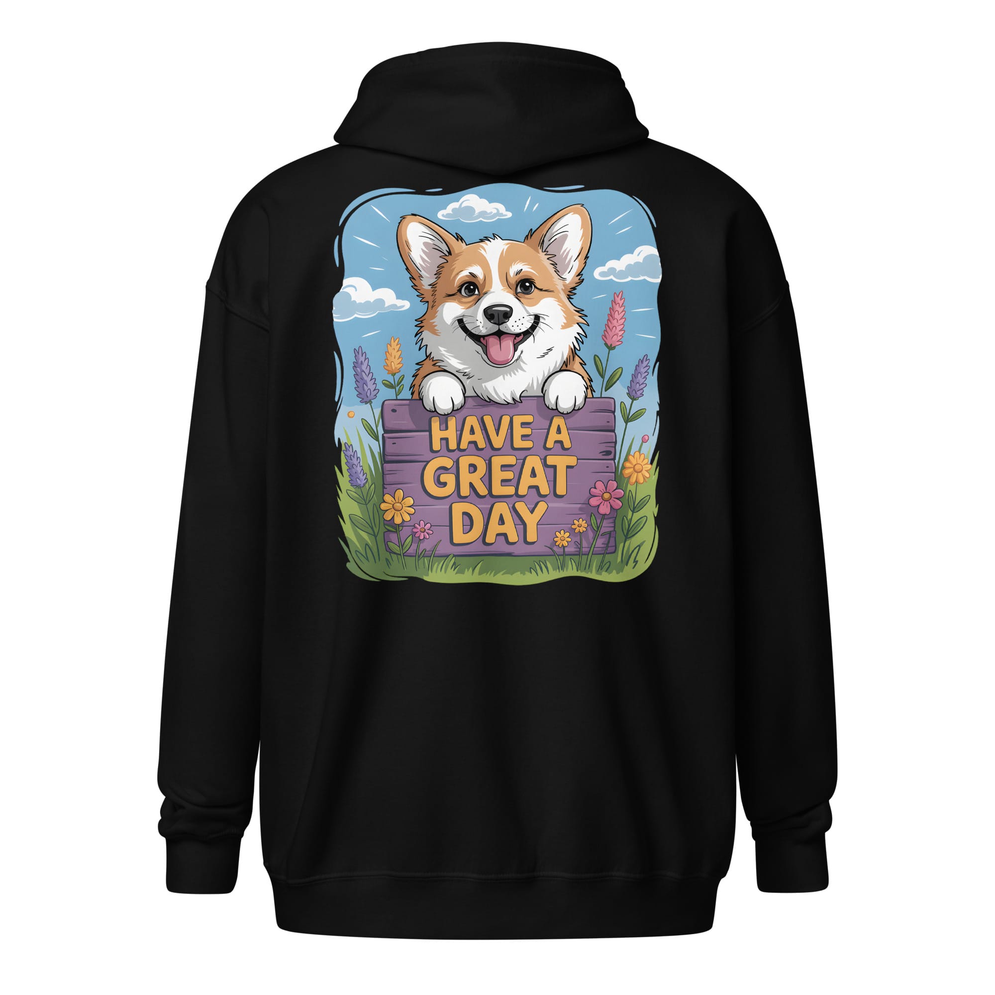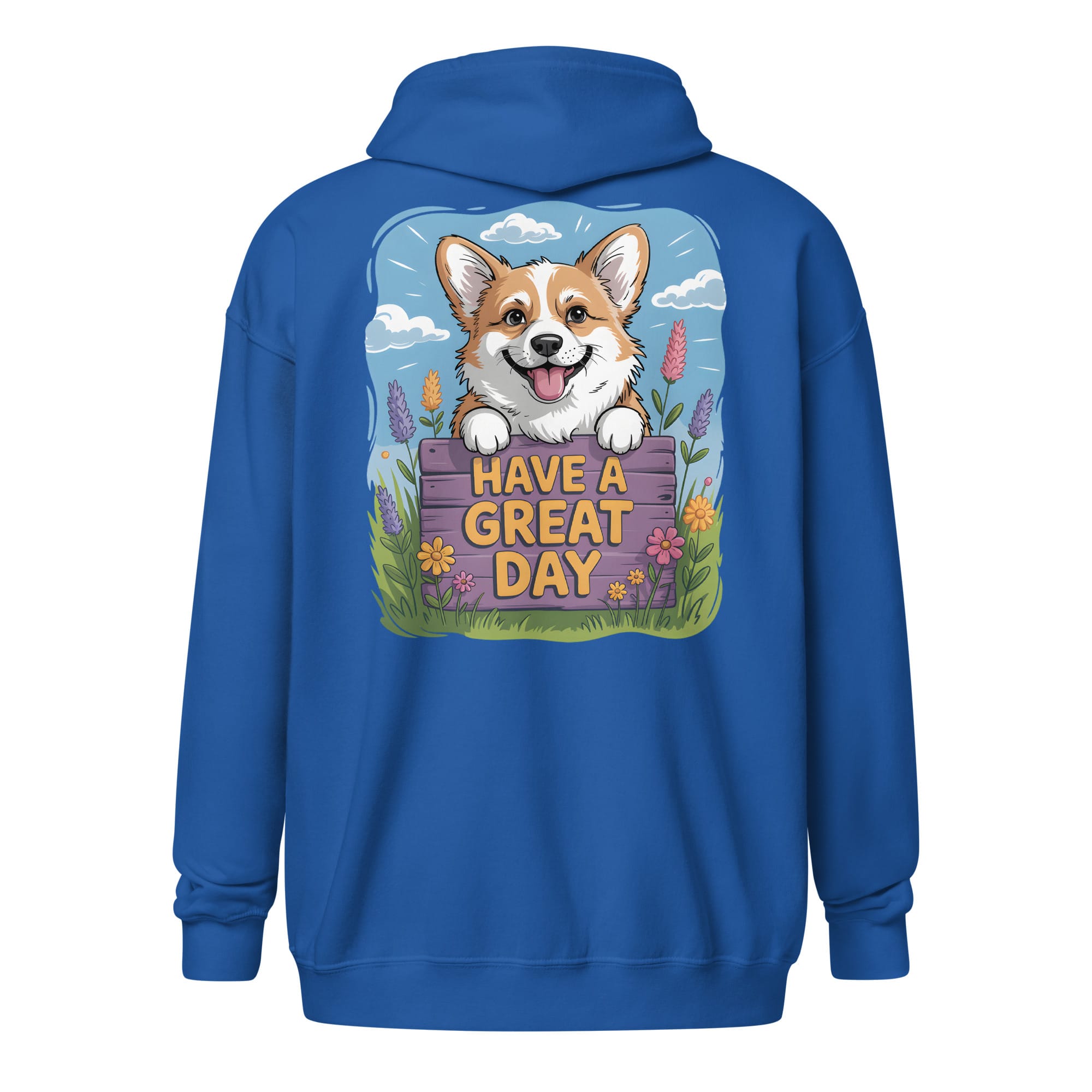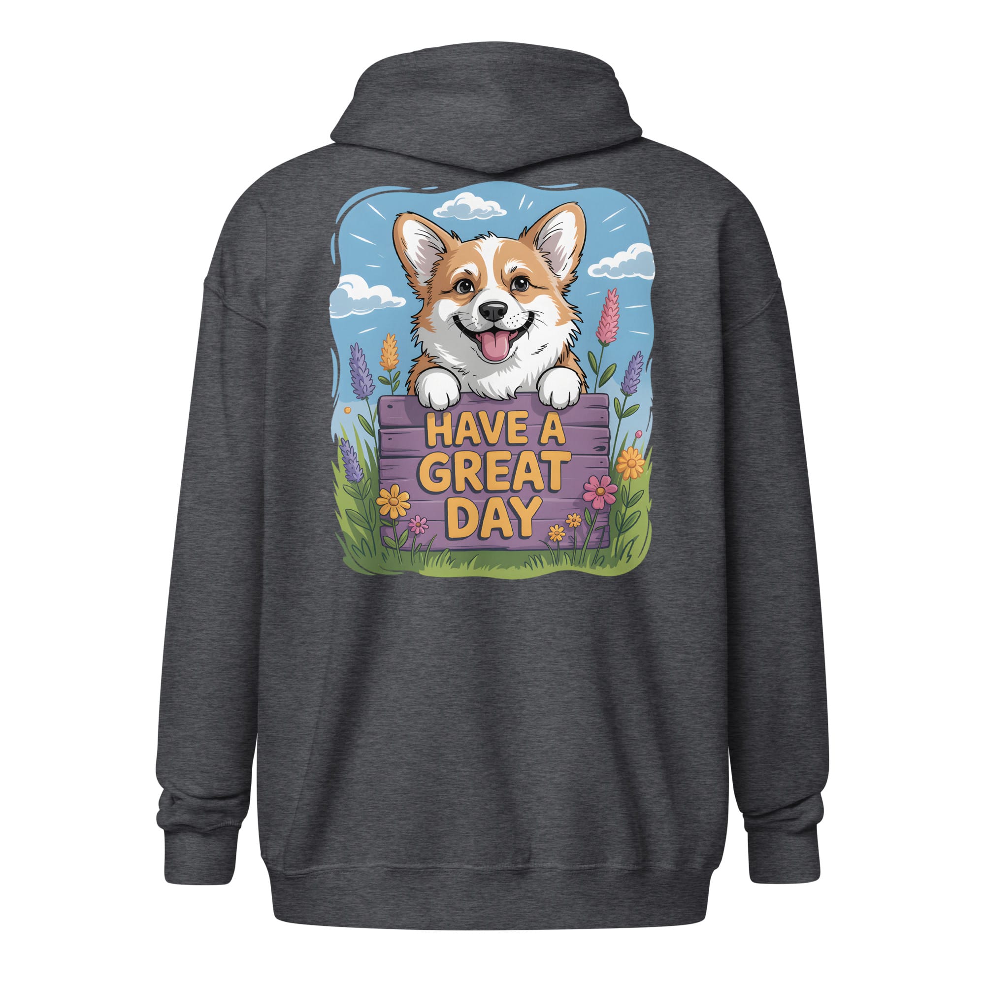 The Perfect Corgi Zip Hoodie (Back Print): “Have a Great Day” Edition