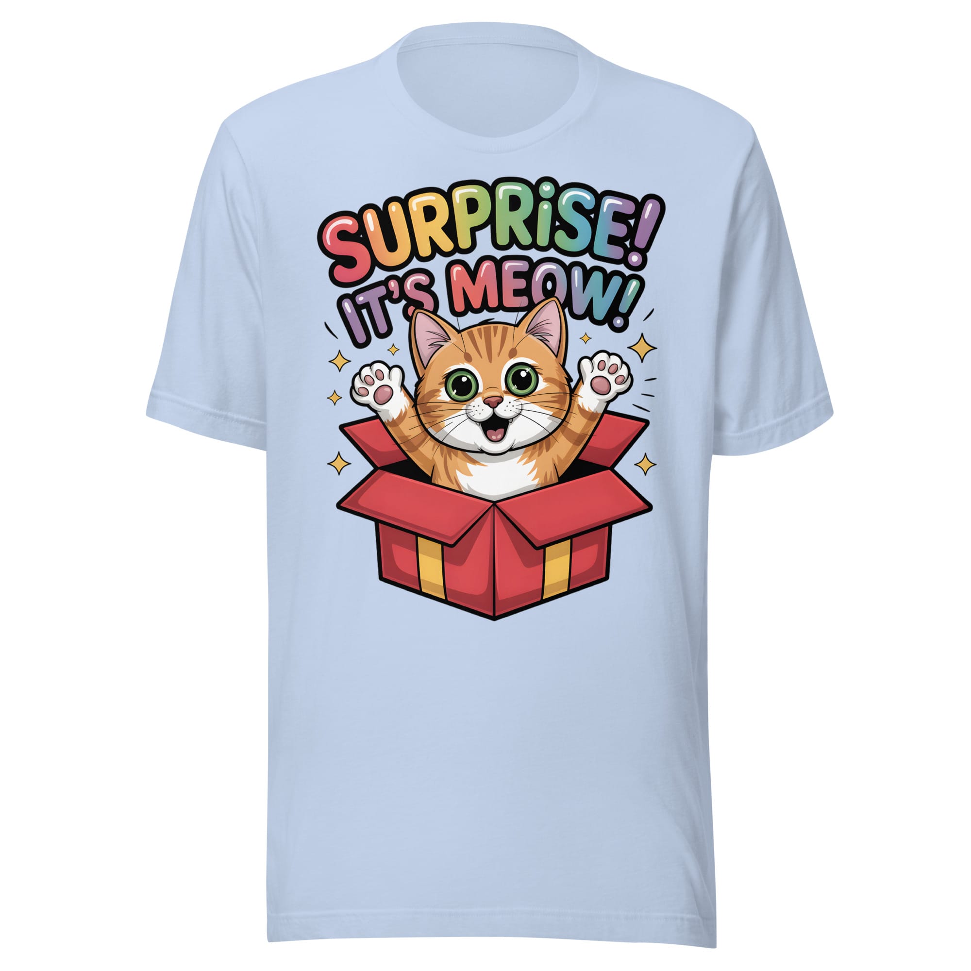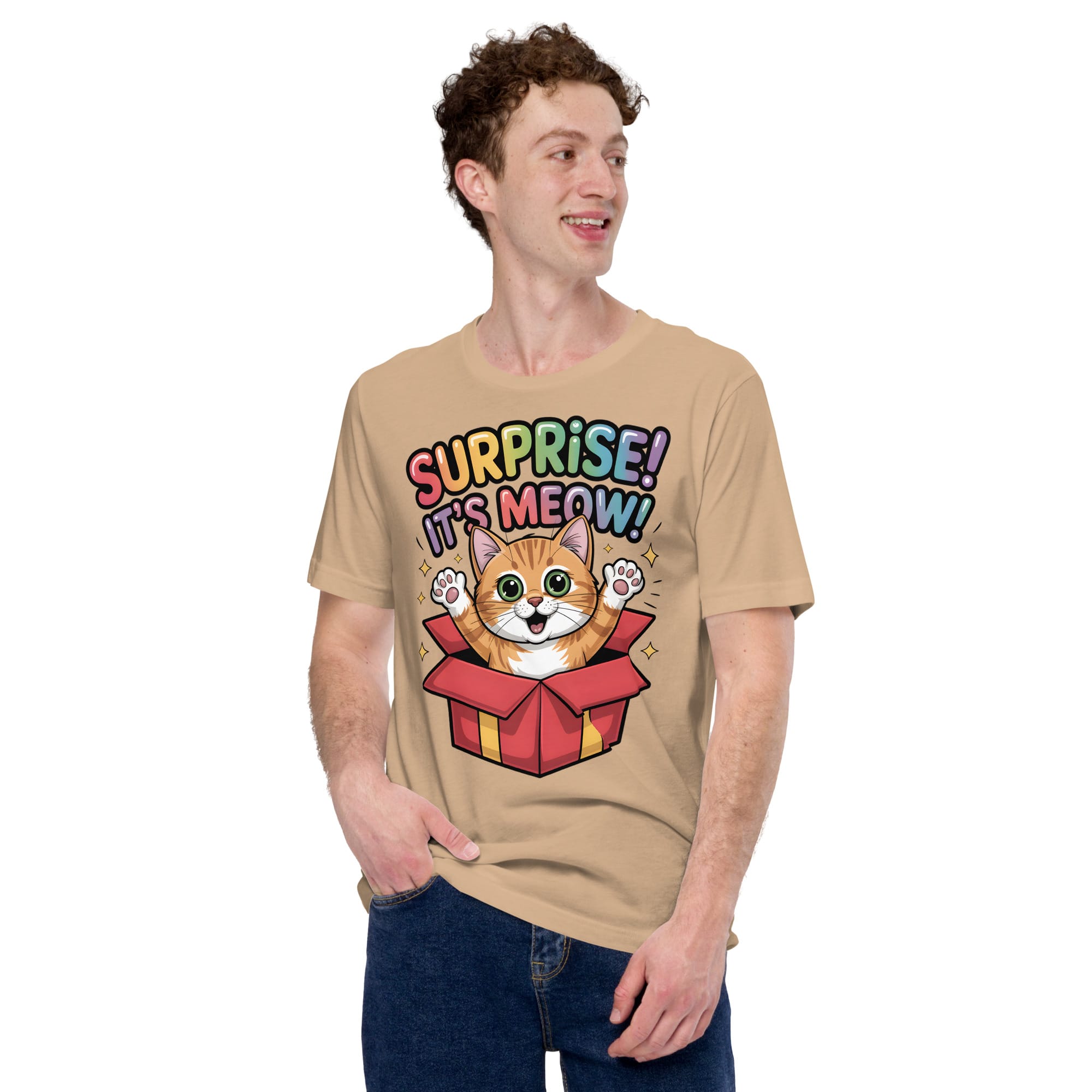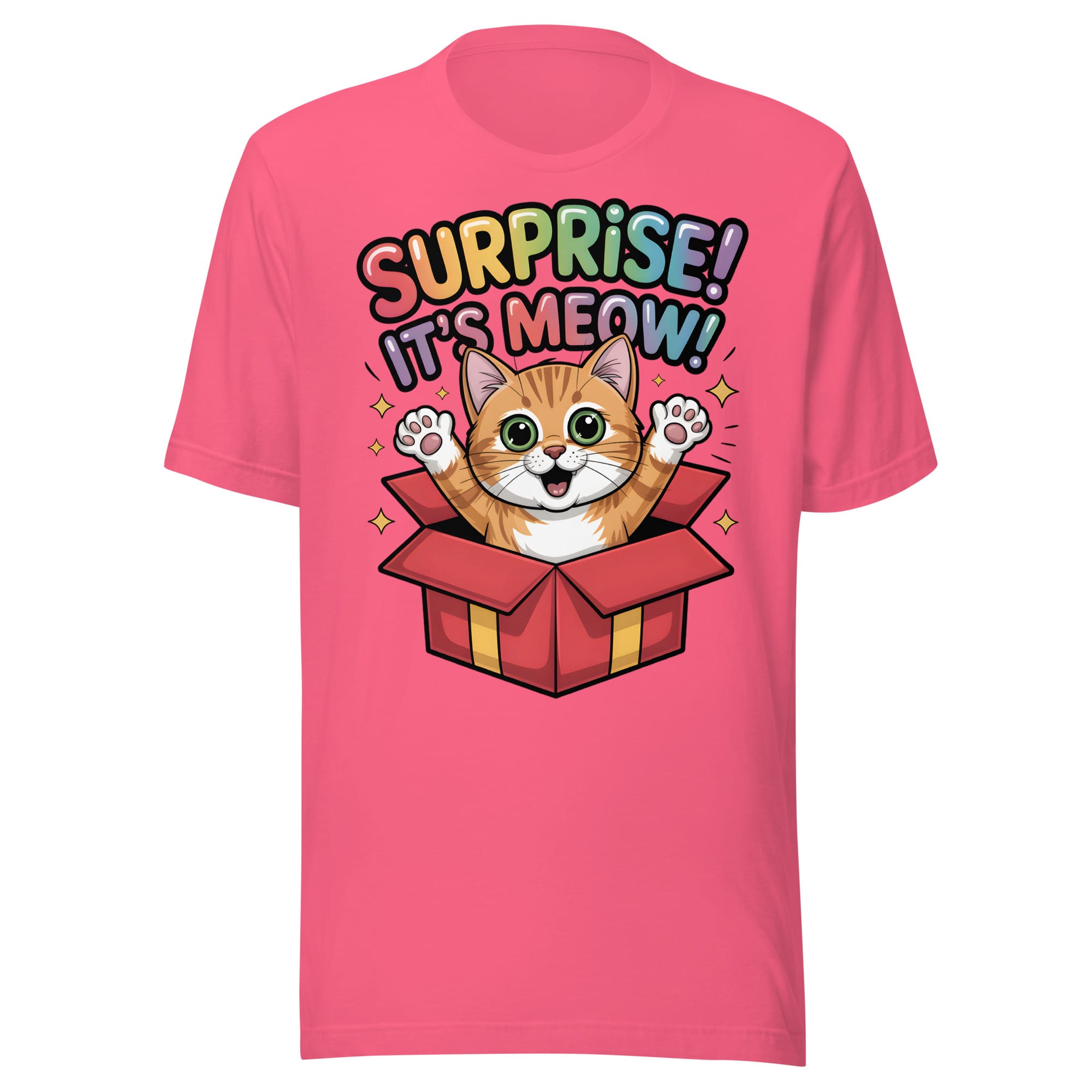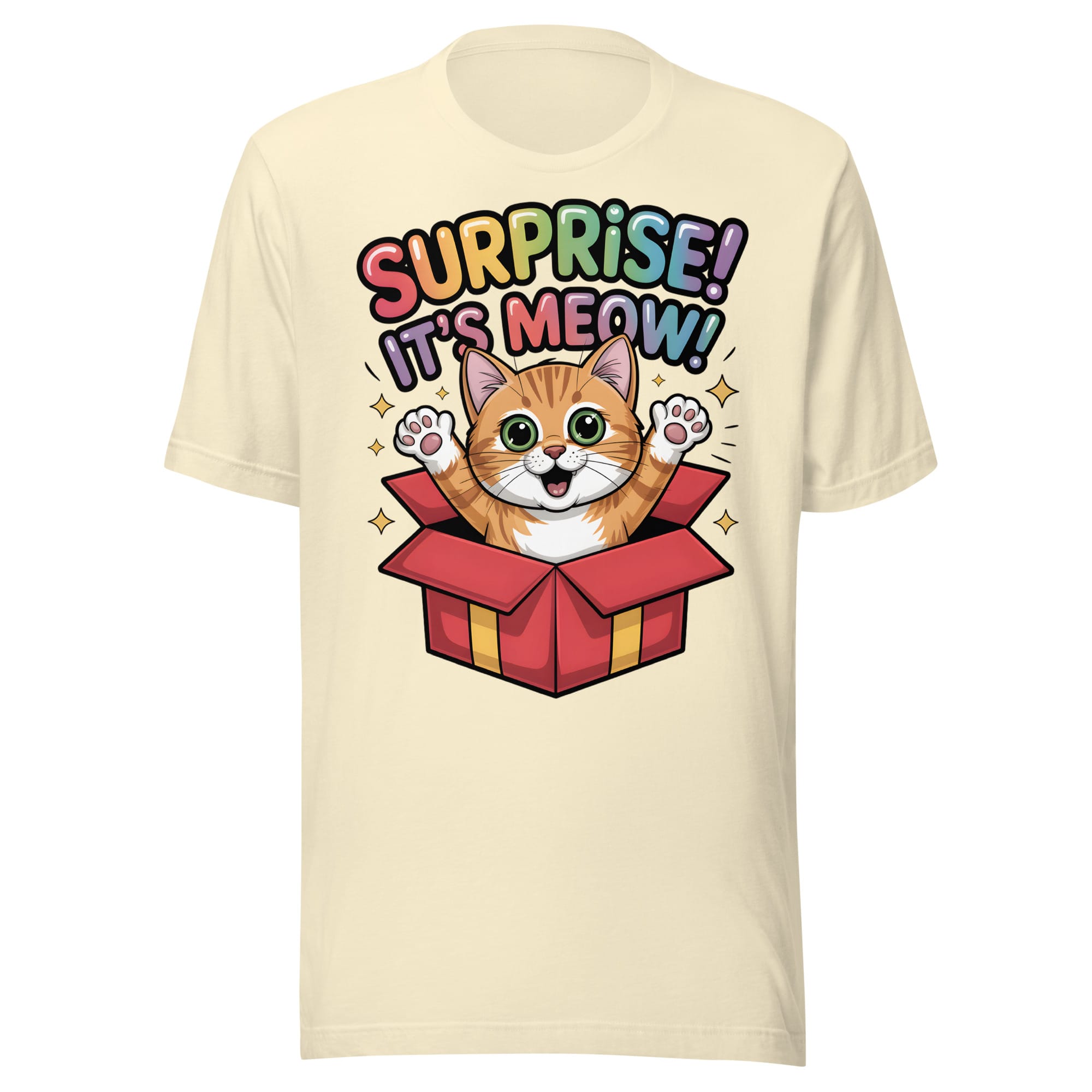 Ready to deliver the cutest surprise? Our Funny Cat Surprise T-Shirt features an adorable kitten joyfully popping out of a colorful gift box, surrounded by playful sparkles. Featuring the witty phrase “SURPRISE! IT’S MEOW!”, this tee is a heartwarming addition for all pet parents and a fantastic way to spread smiles for cat moms and dads everywhere. Whether it’s for a birthday or a special treat, this shirt is pure happiness.