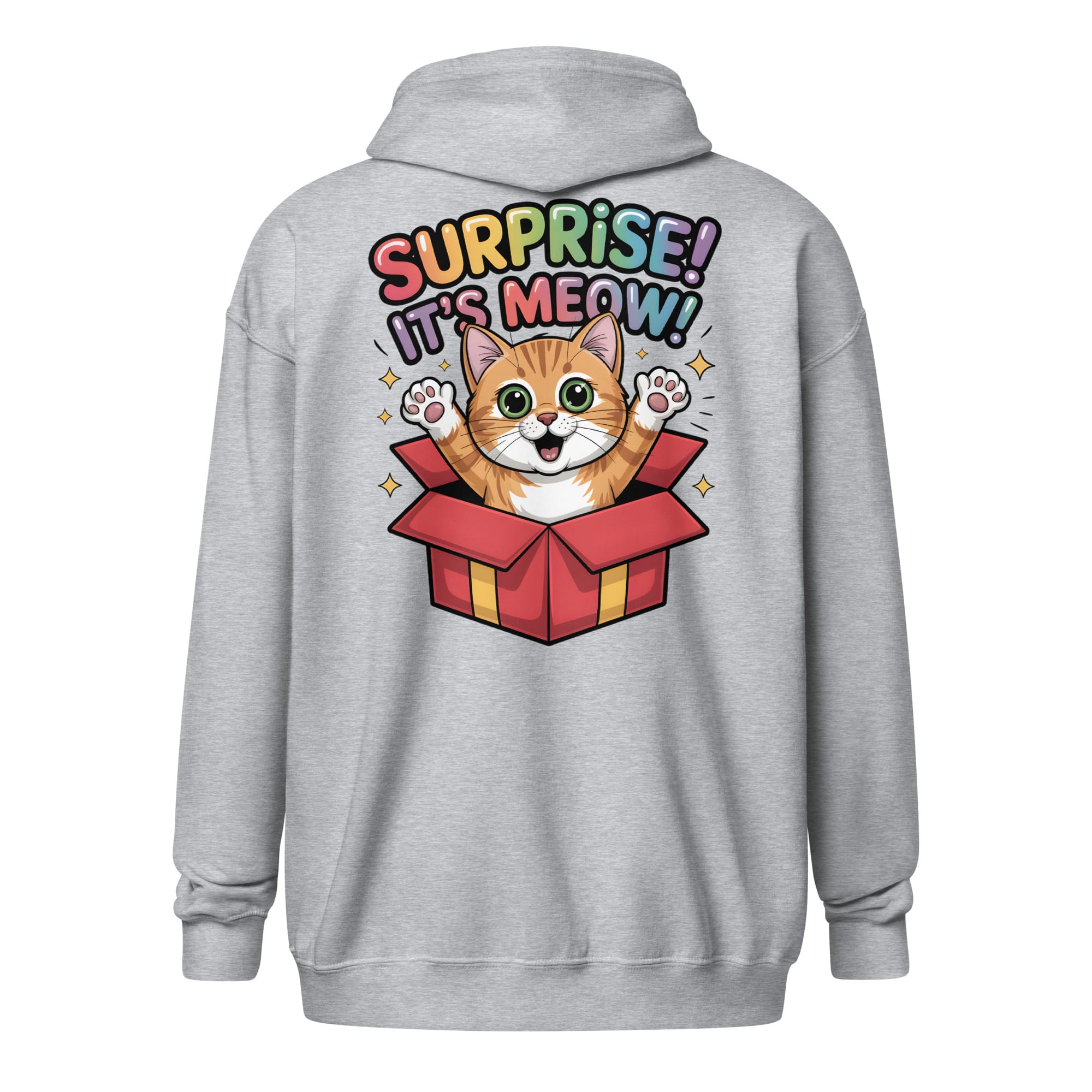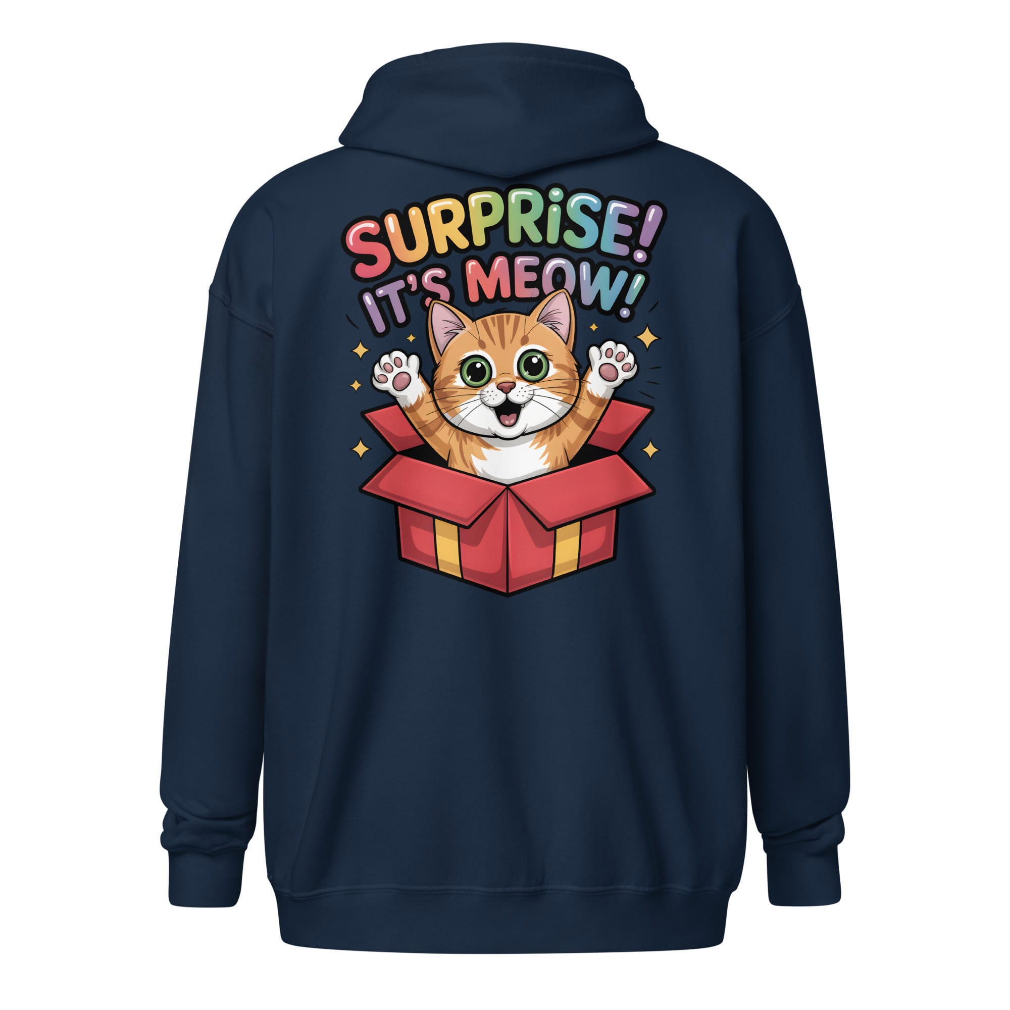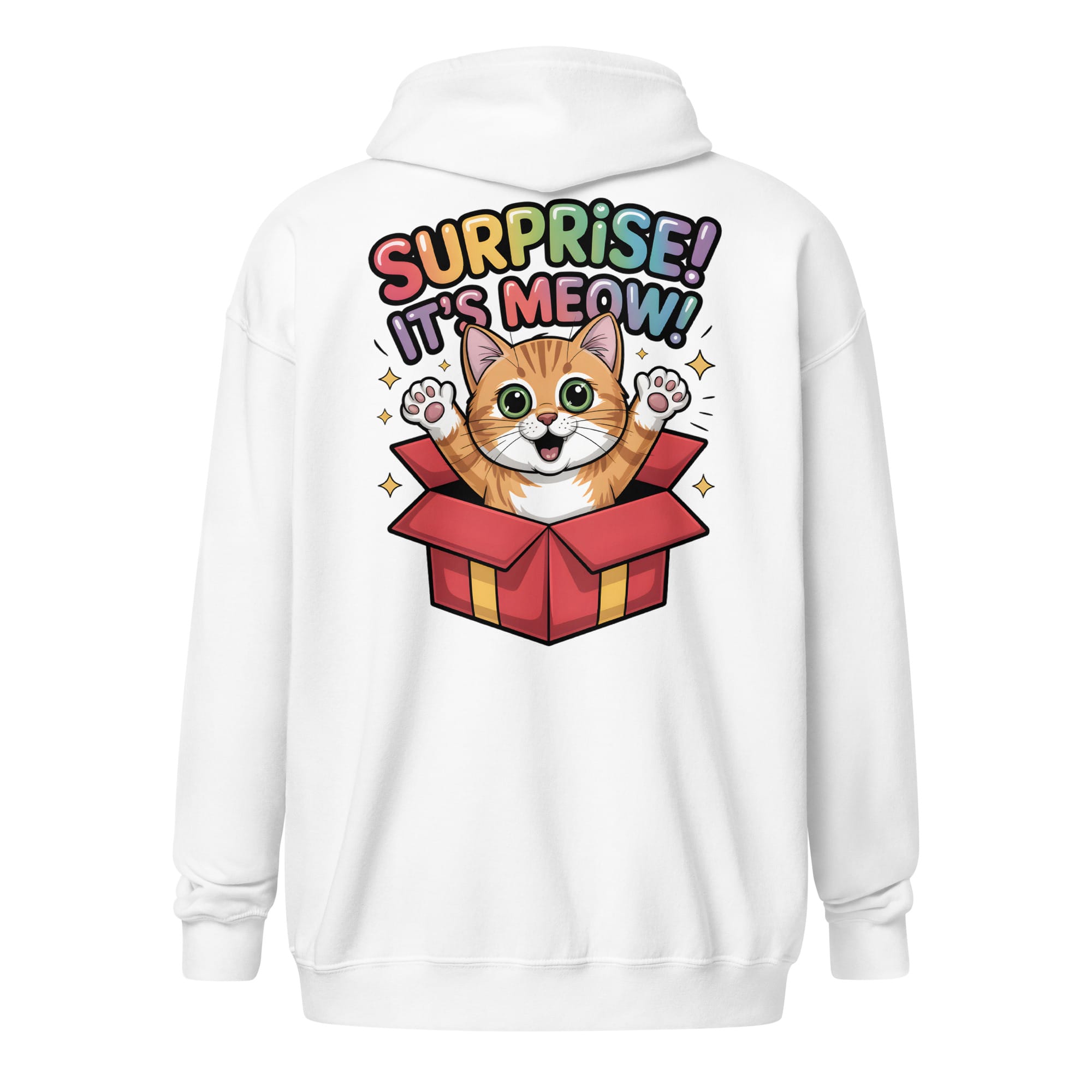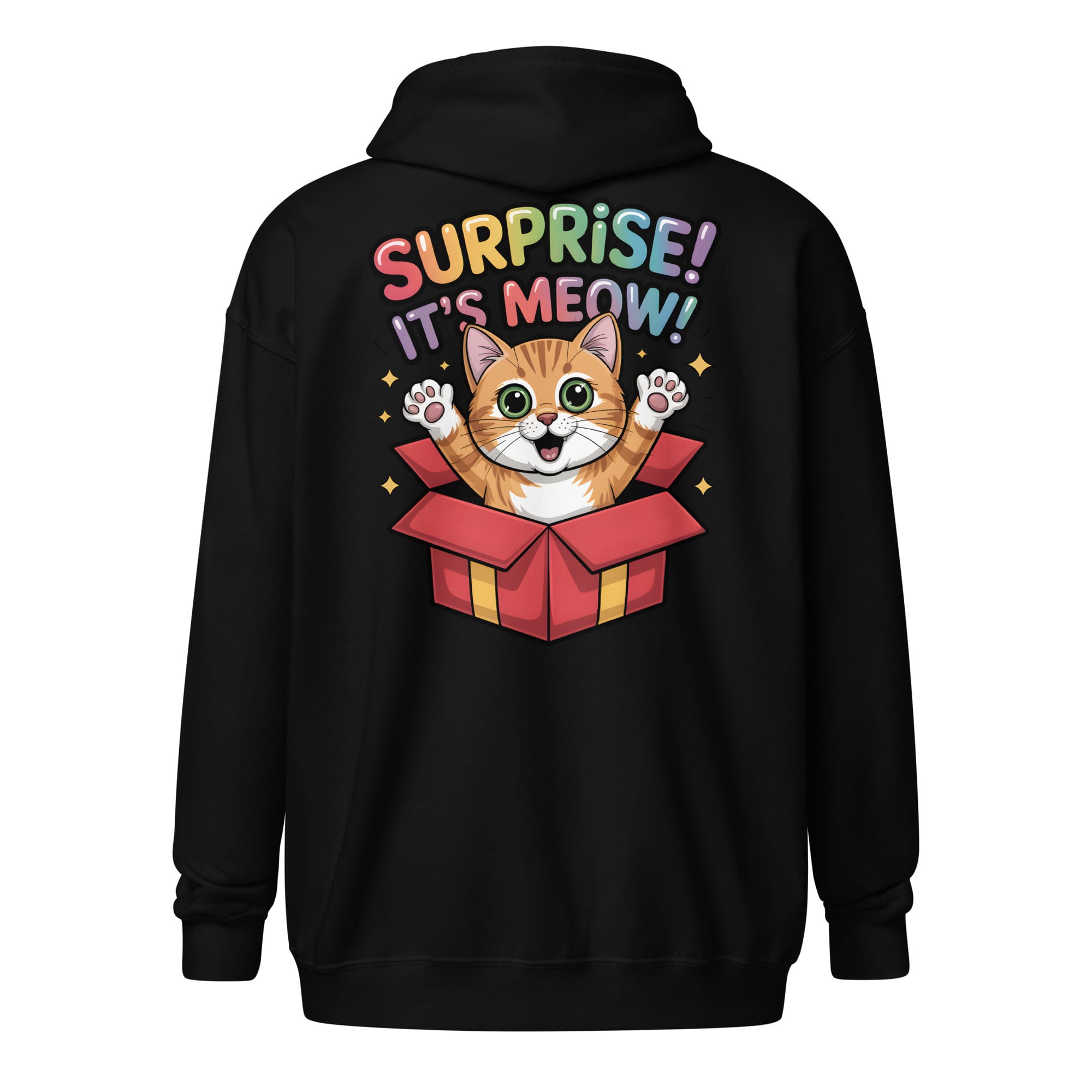 Ready to deliver the cutest surprise? Our Unisex Zip Hoodie features a vibrant kitten joyfully bursting out of a red gift box, printed boldly on the back. This playful, eye-catching design, combined with the witty phrase “SURPRISE! IT’S MEOW!”, makes this functional layer a heartwarming addition for all pet parents and a fantastic way to spread smiles for cat moms and dads everywhere. Perfect for any occasion and available in various colors to suit your style.