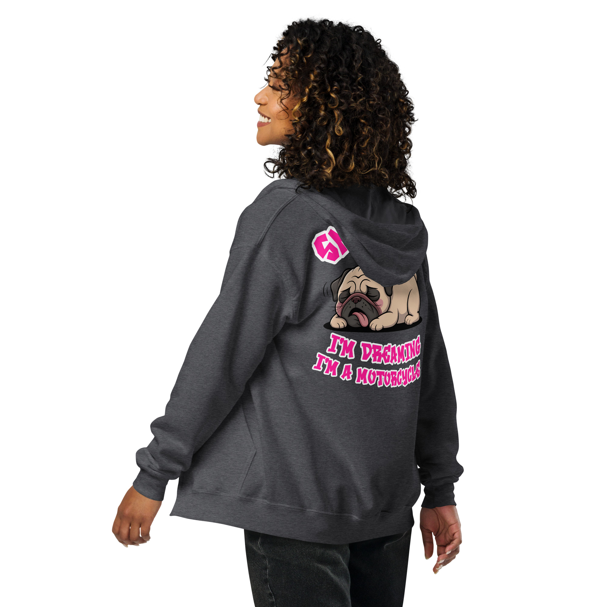 Introducing the ultimate zip hoodie for anyone who appreciates a clean, classic look with a hilarious secret. From the front, it’s your favorite everyday hoodie. But turn around, and it reveals the real reason for that gentle rumble—it’s not snoring, it’s a motorcycle dream!