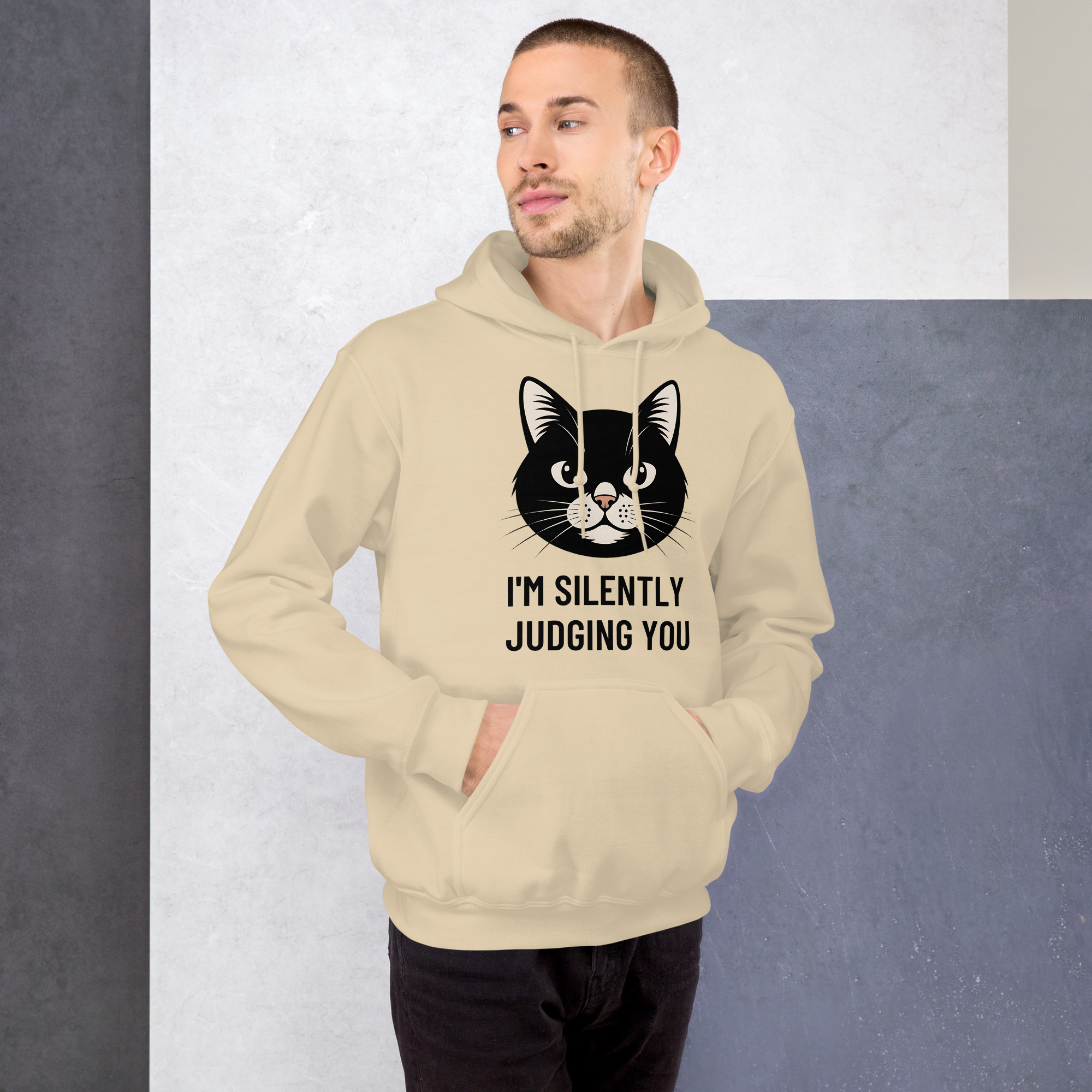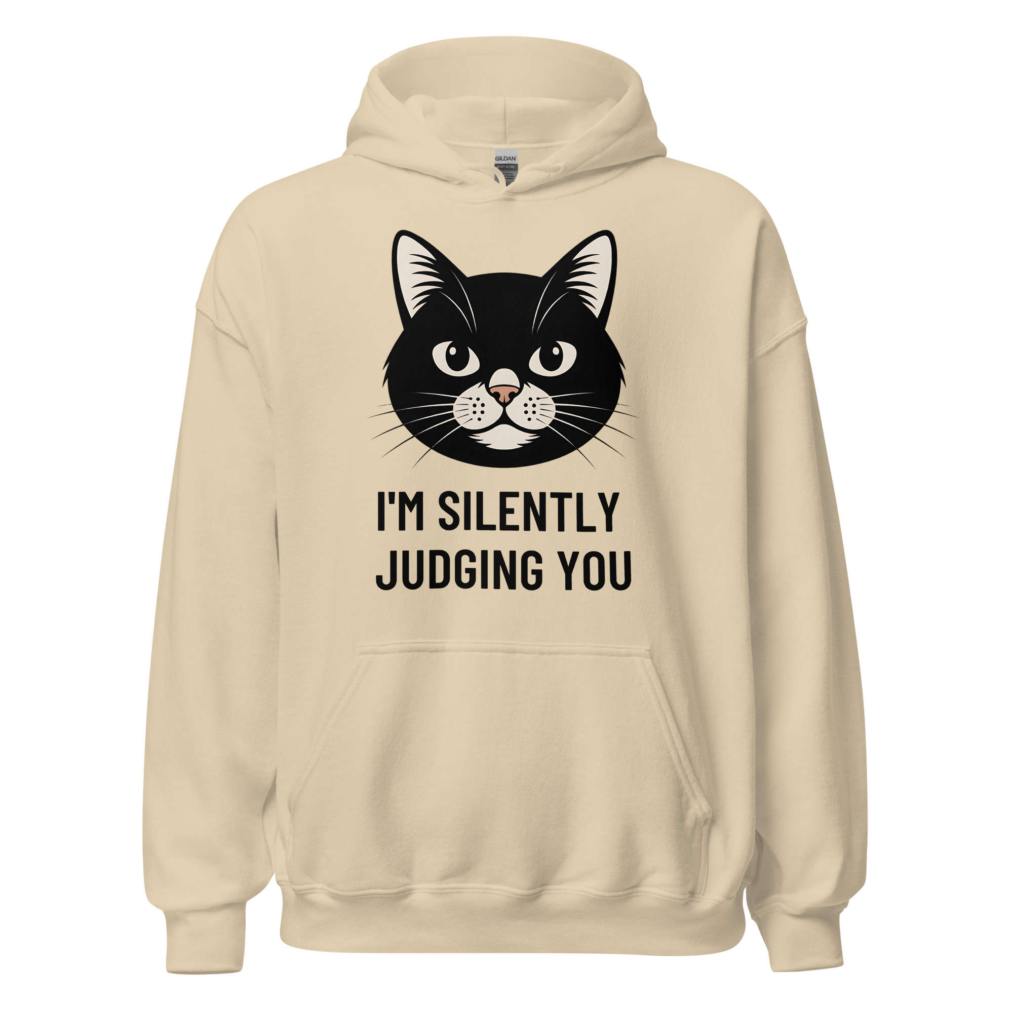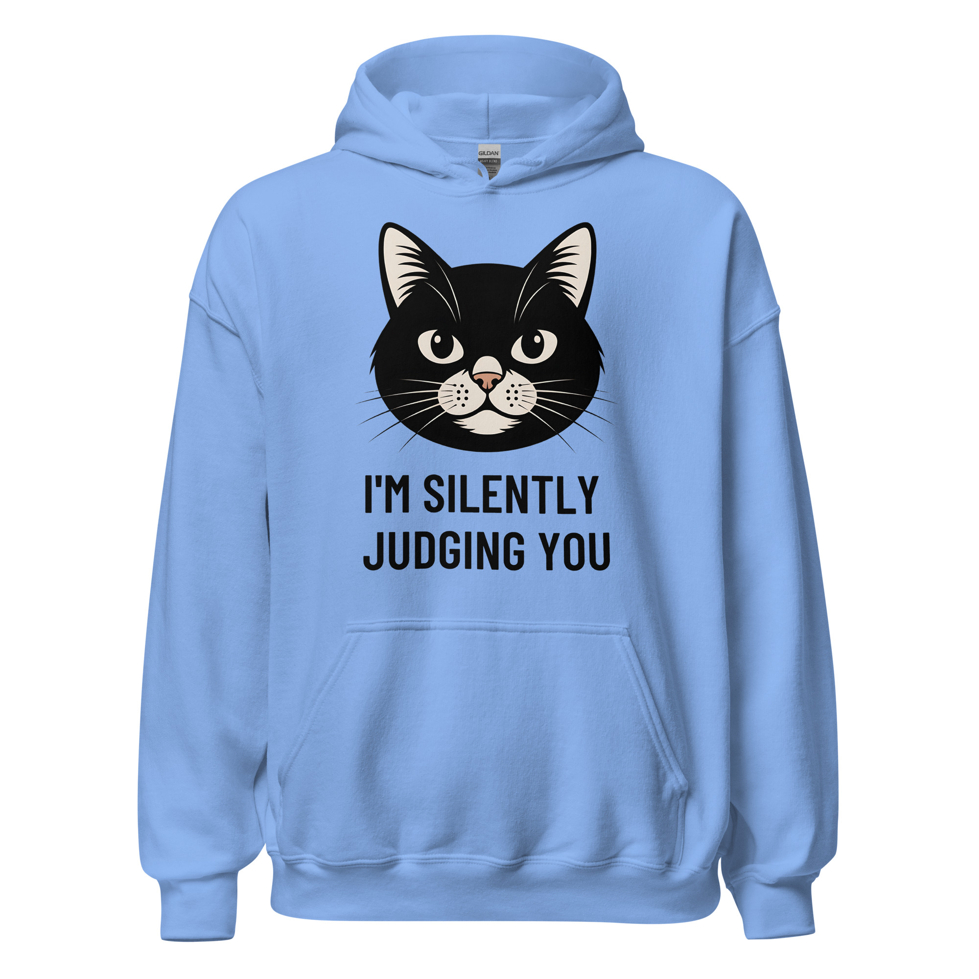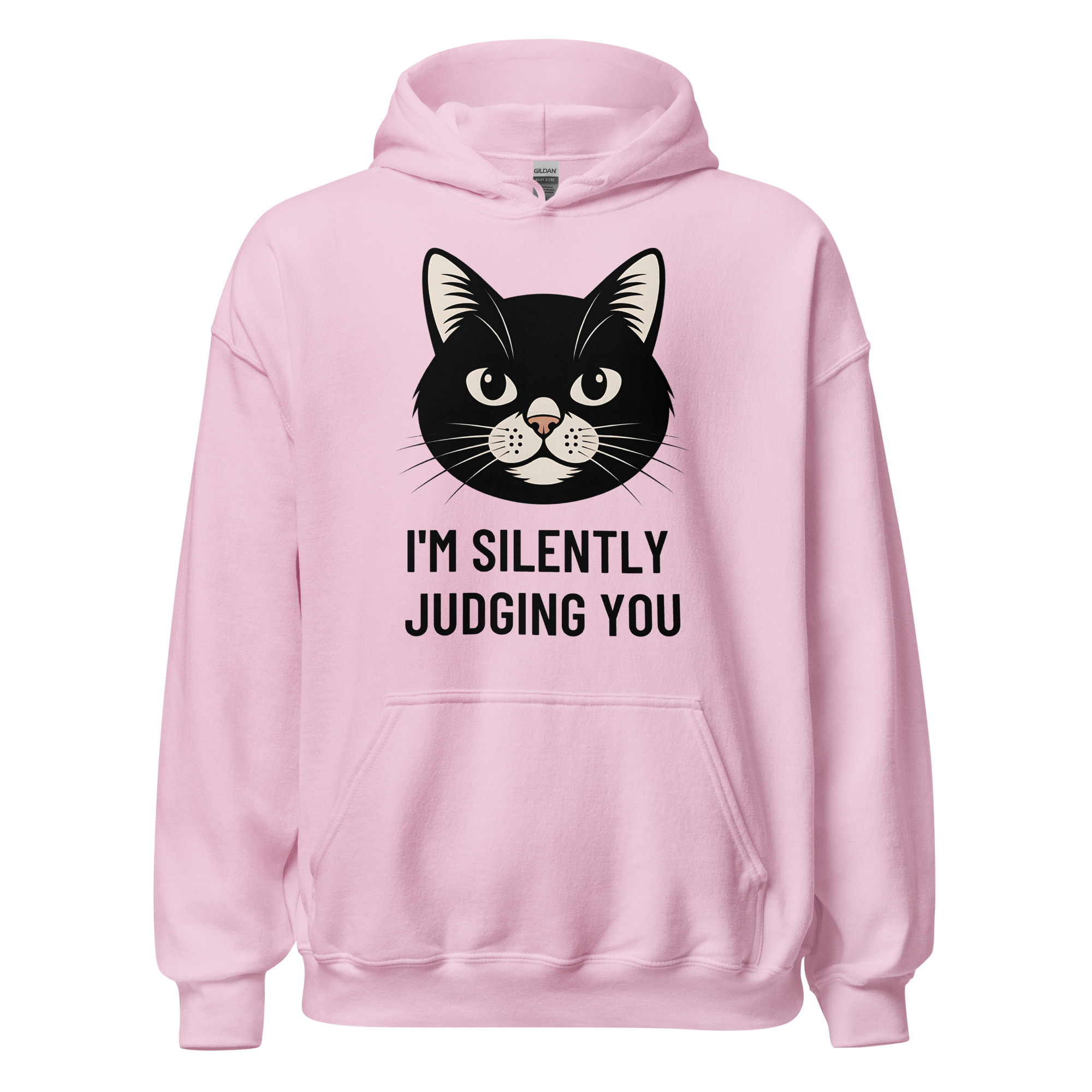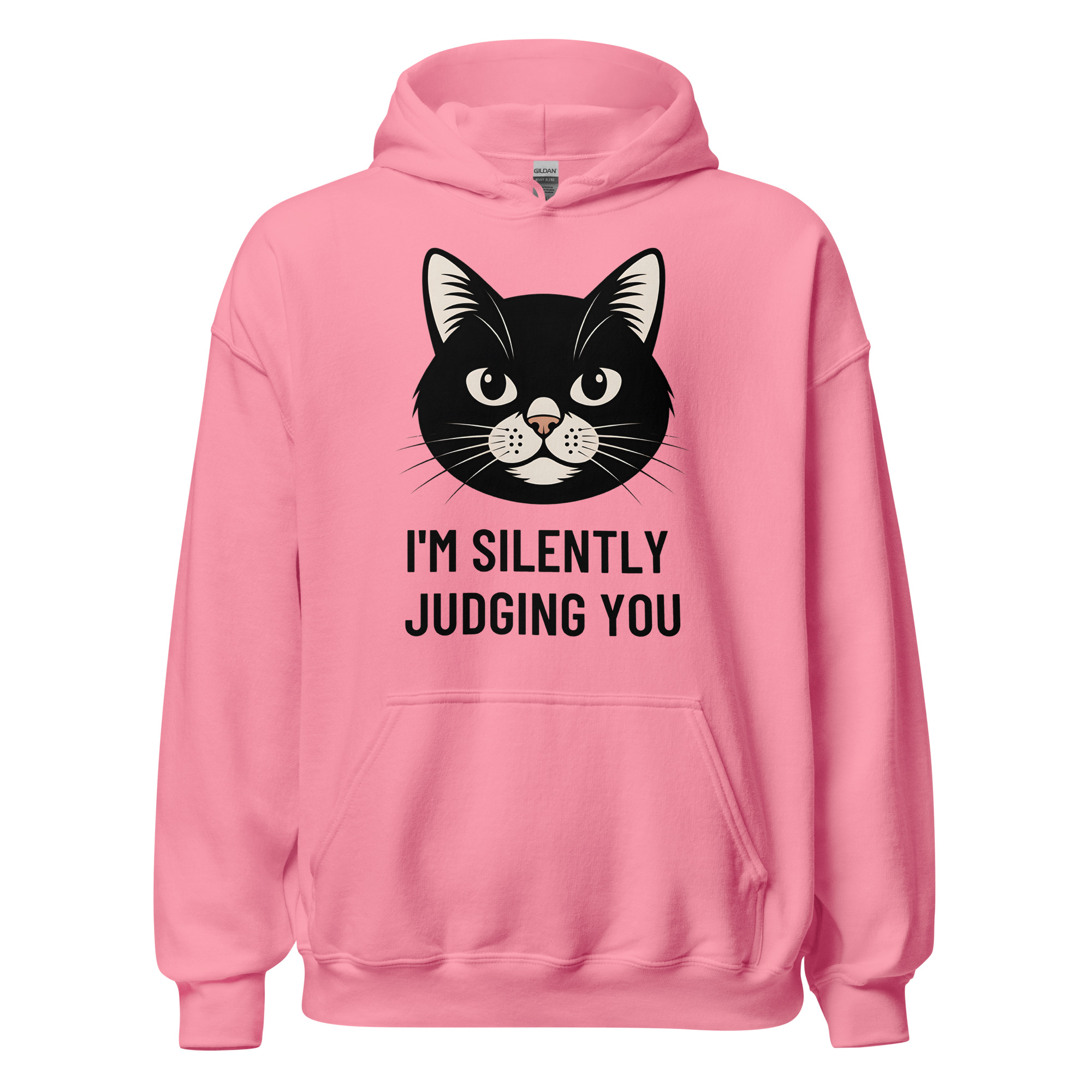 Who says you can’t be comfortable while silently critiquing the world around you? Our “I’m Silently Judging You” hoodie is the ultimate uniform for cat lovers with a sarcastic streak. Featuring an unamused (but adorable) black cat, this hooded sweatshirt is your go-to for chilly evenings, lazy days on the couch, or any time you want to let your apparel do the talking.