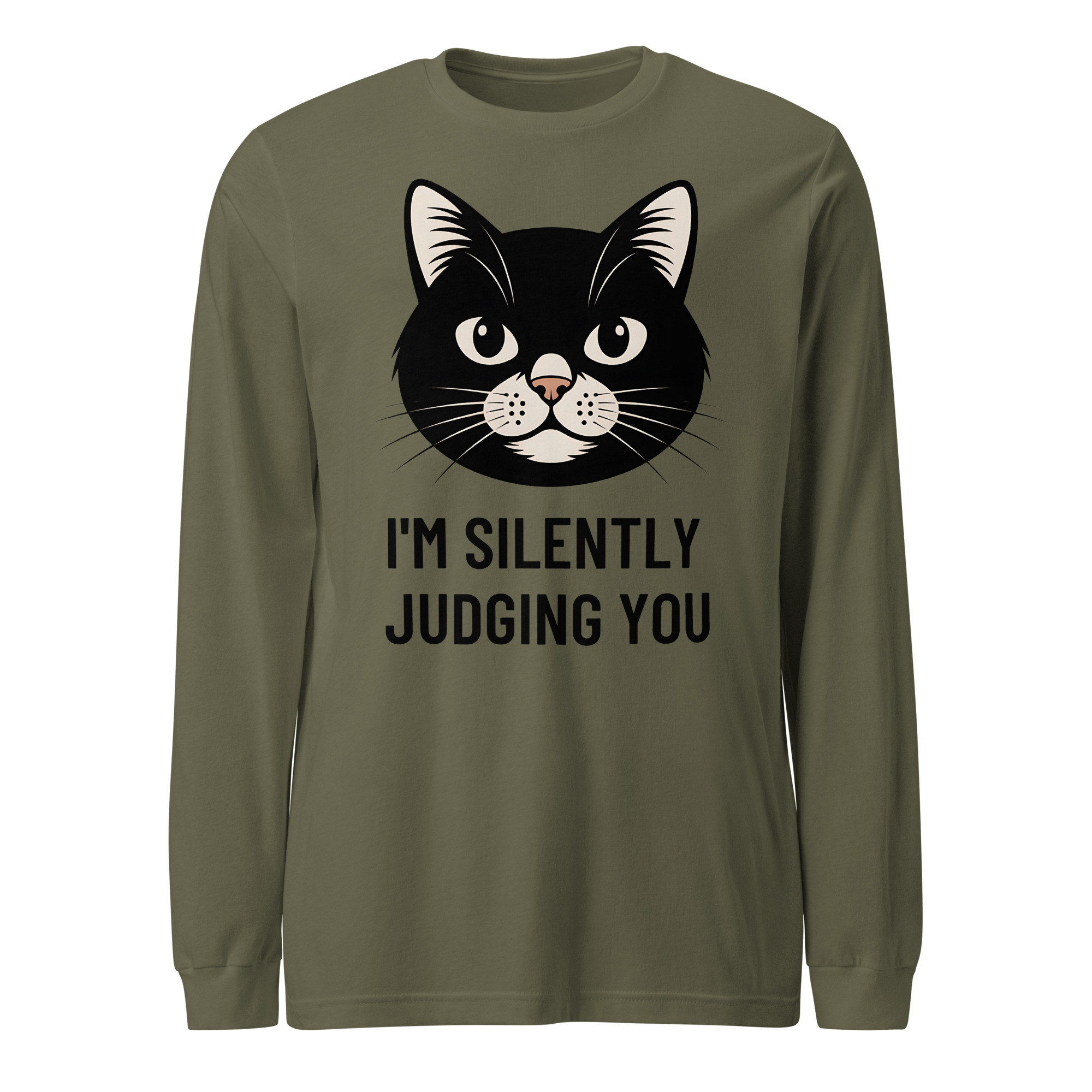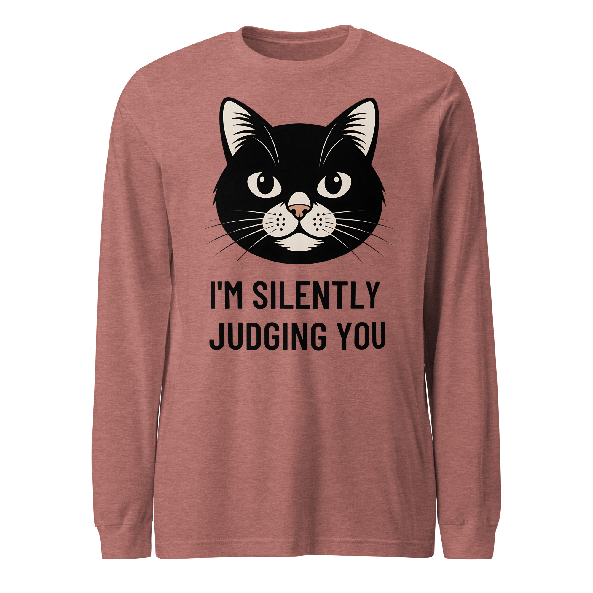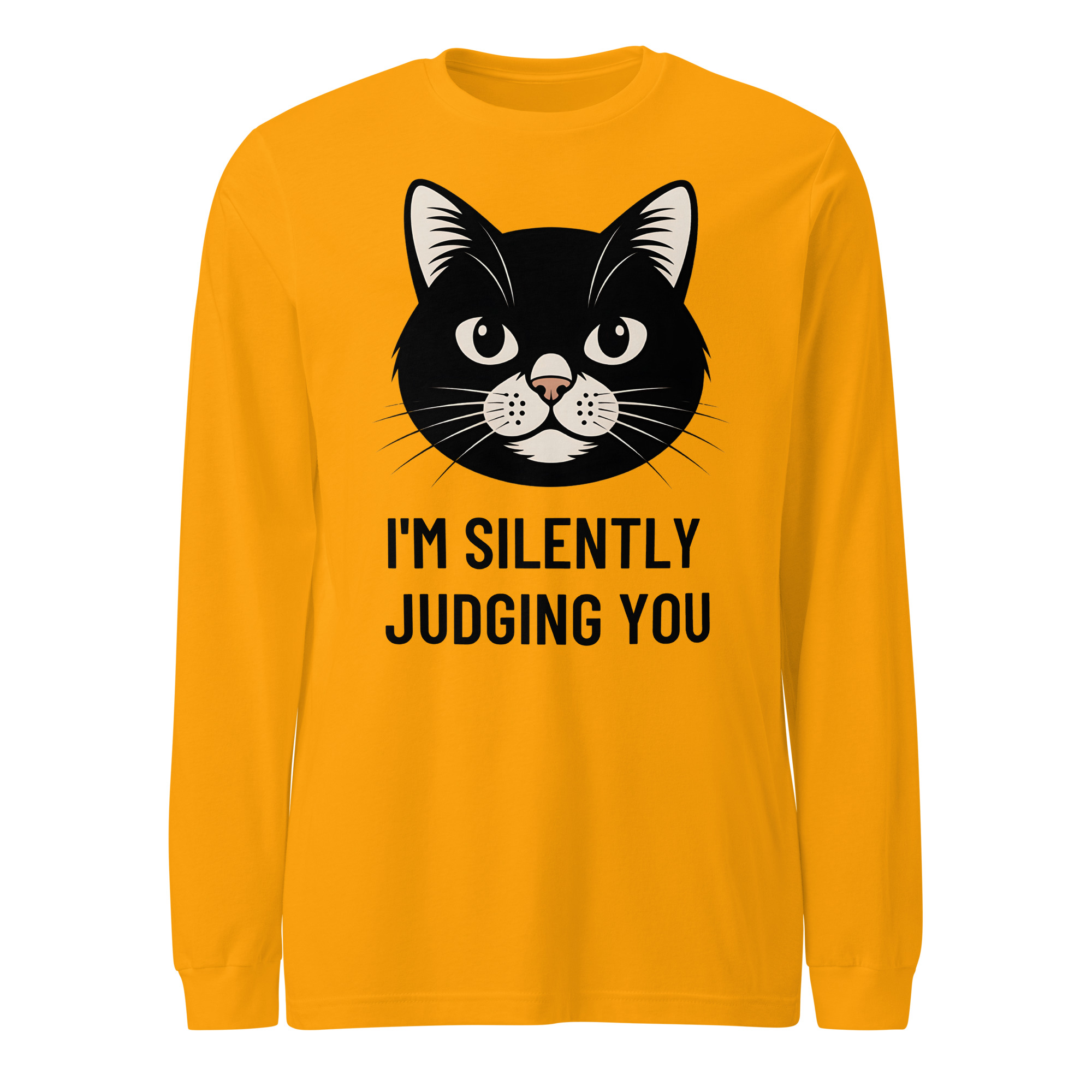 For those days when you need a little extra coverage and a whole lot of personality, our “I’m Silently Judging You” long sleeve tee is the perfect fit. This shirt combines the cozy comfort of a long sleeve with the sharp wit of a judgmental black cat, making it an essential piece for any cat lover’s wardrobe.