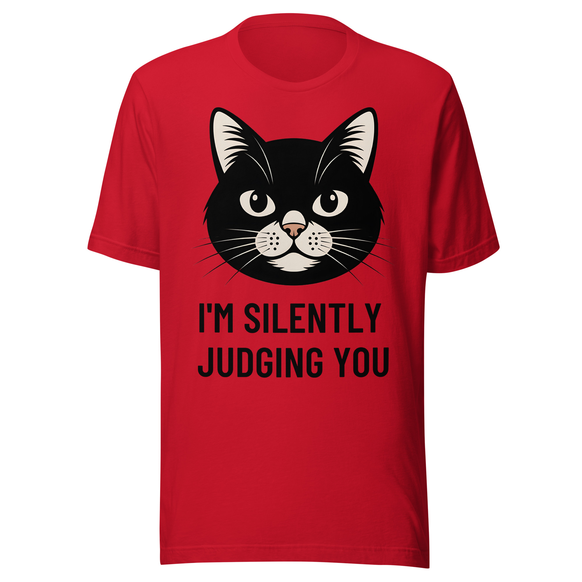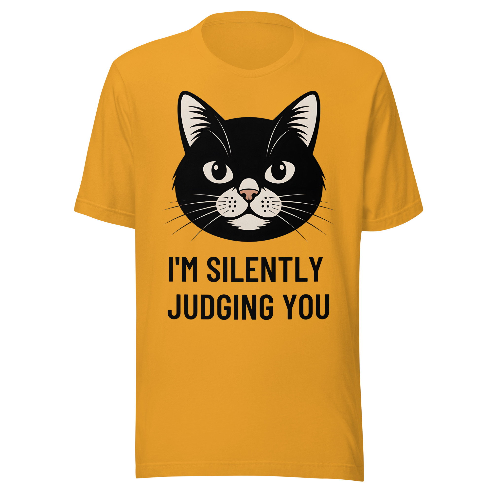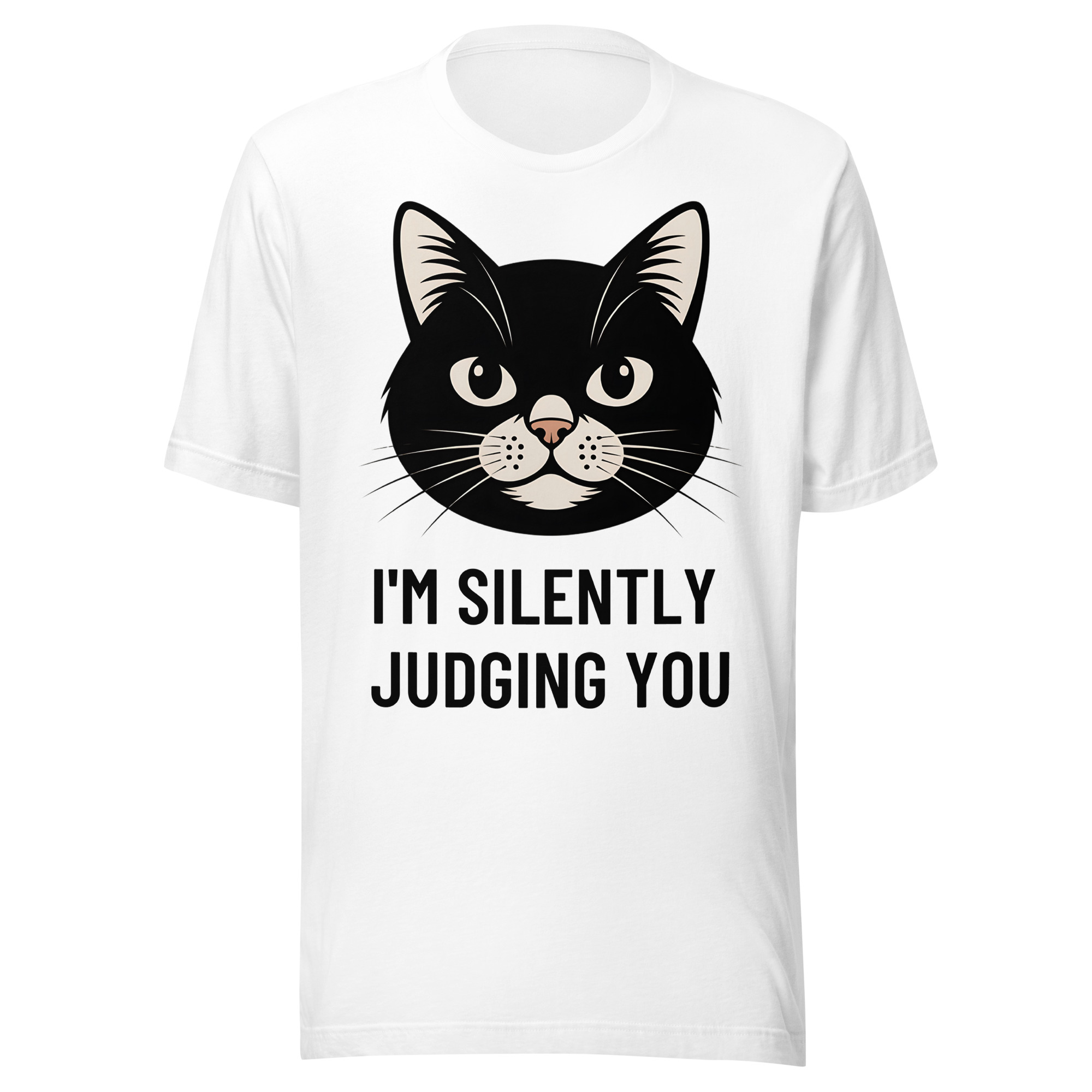 Embrace your inner feline with our hilarious “I’m Silently Judging You” t-shirt. Featuring a bold, adorable black cat with a classic judgmental stare, this shirt is perfect for anyone who appreciates cat-like sarcasm and a good laugh.