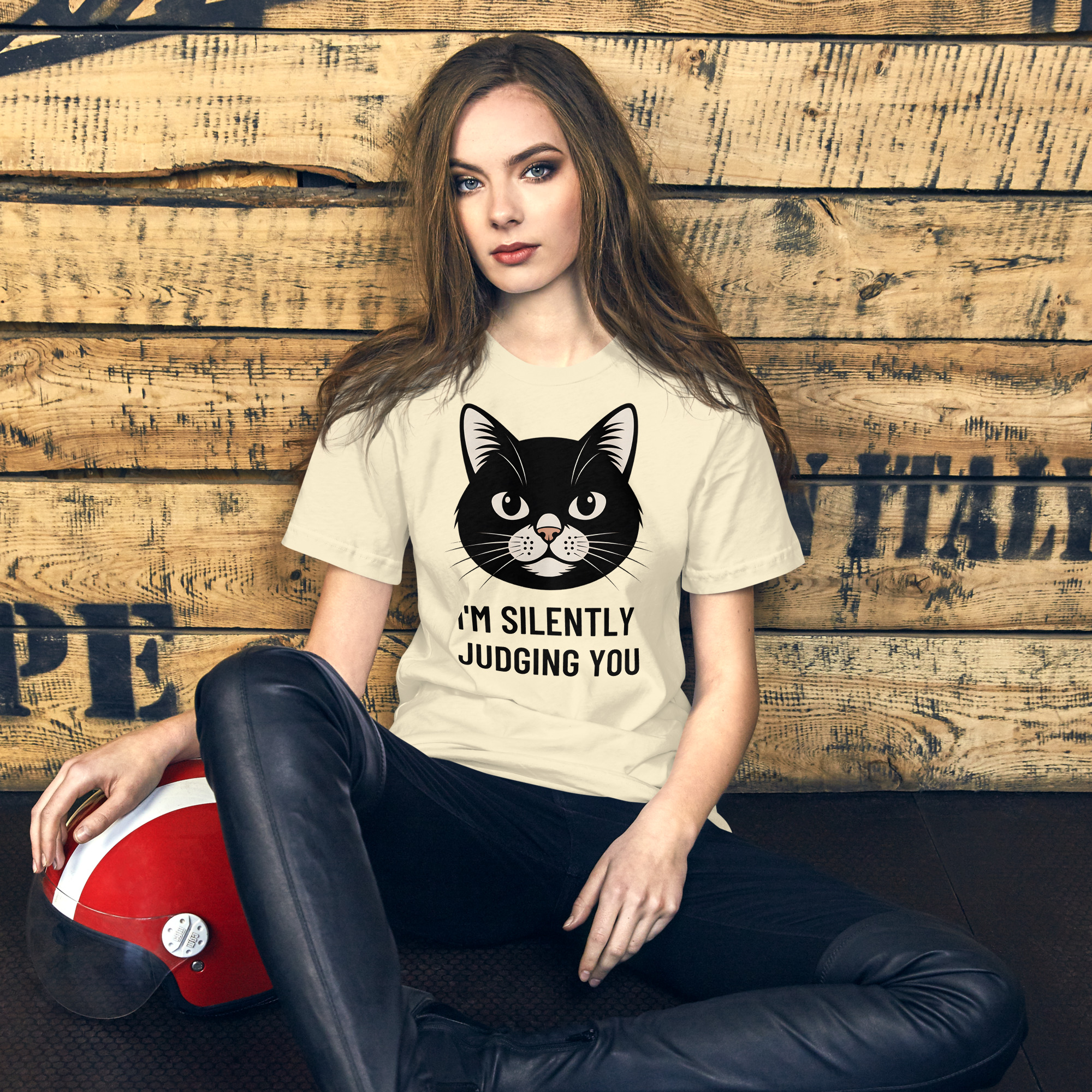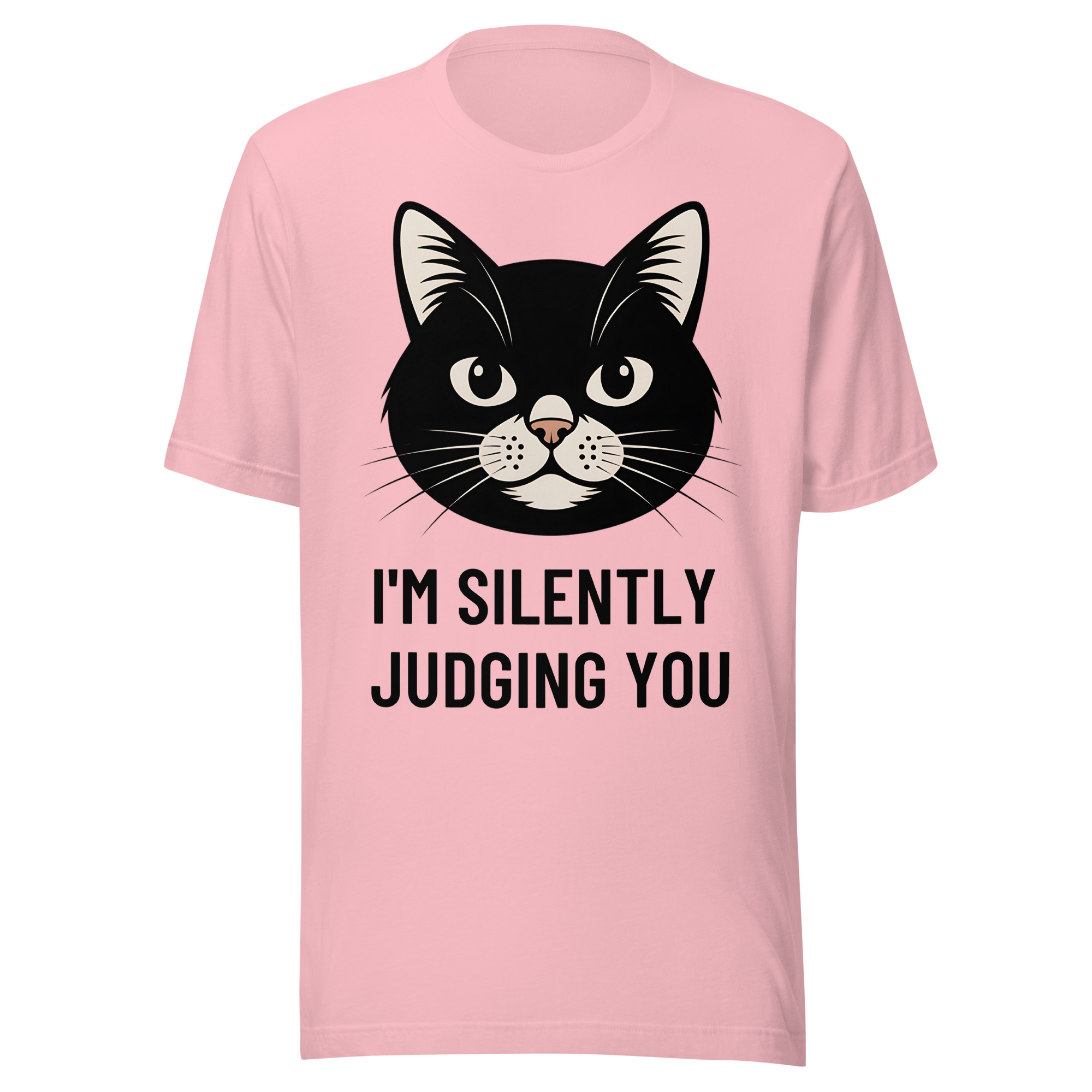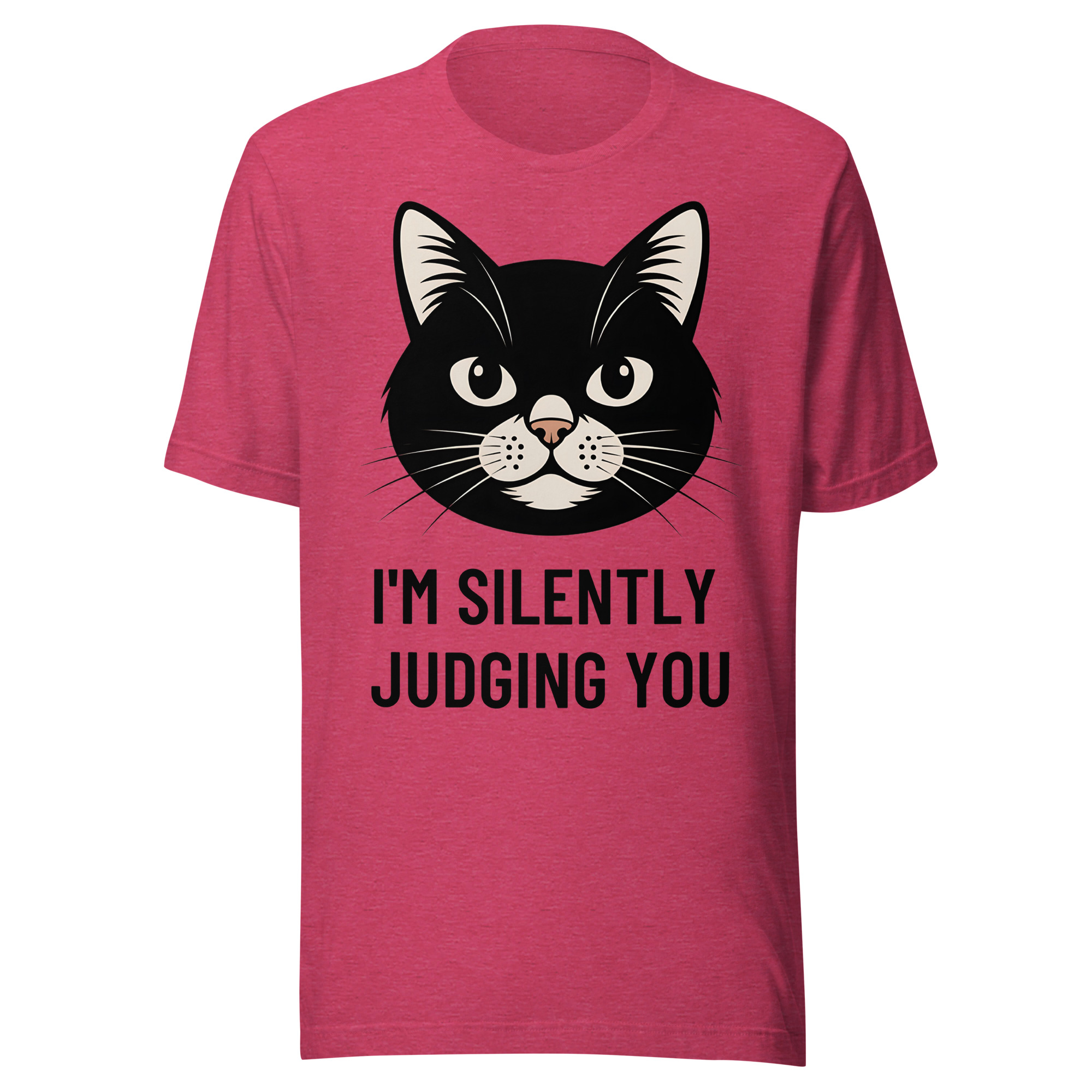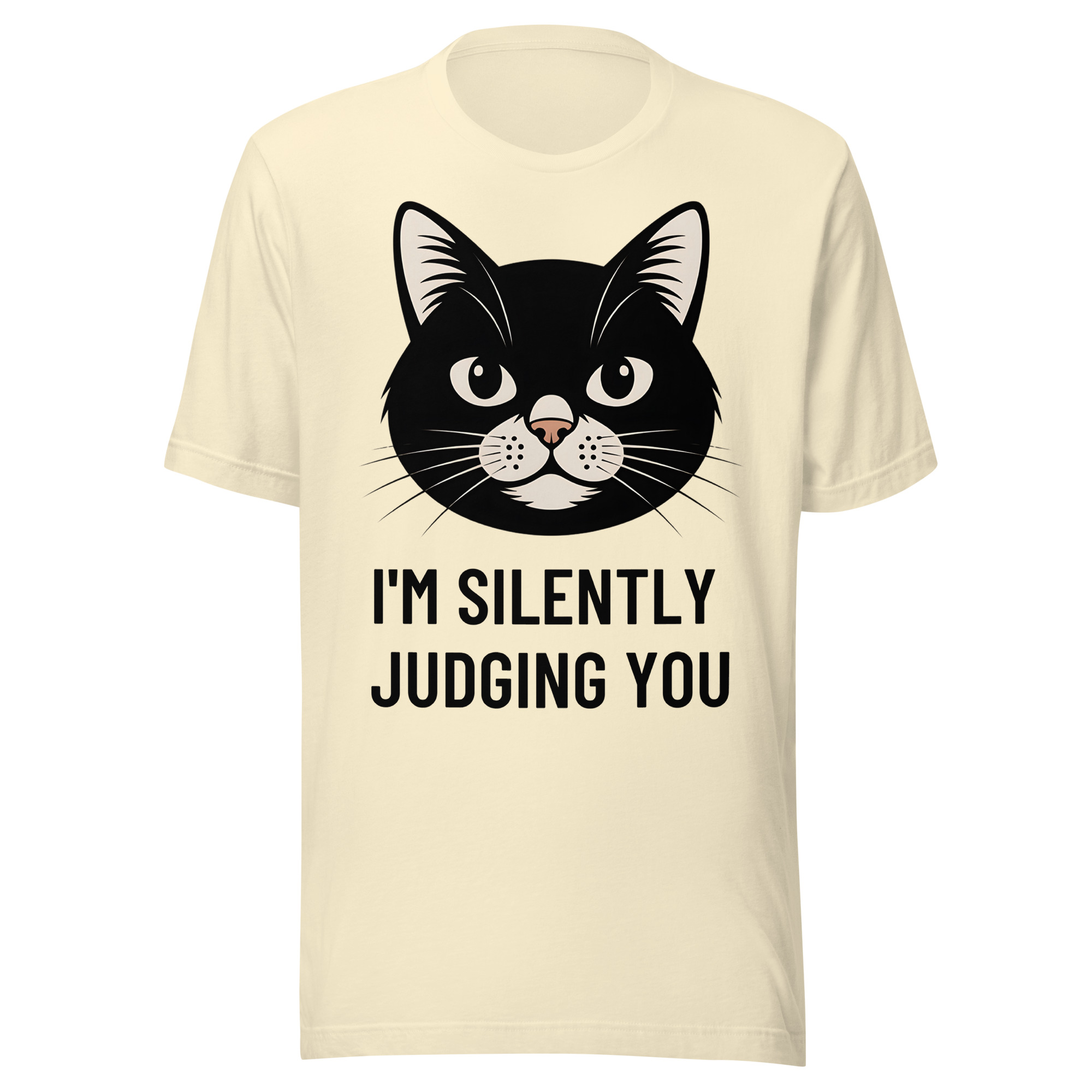 Embrace your inner feline with our hilarious “I’m Silently Judging You” t-shirt. Featuring a bold, adorable black cat with a classic judgmental stare, this shirt is perfect for anyone who appreciates cat-like sarcasm and a good laugh.