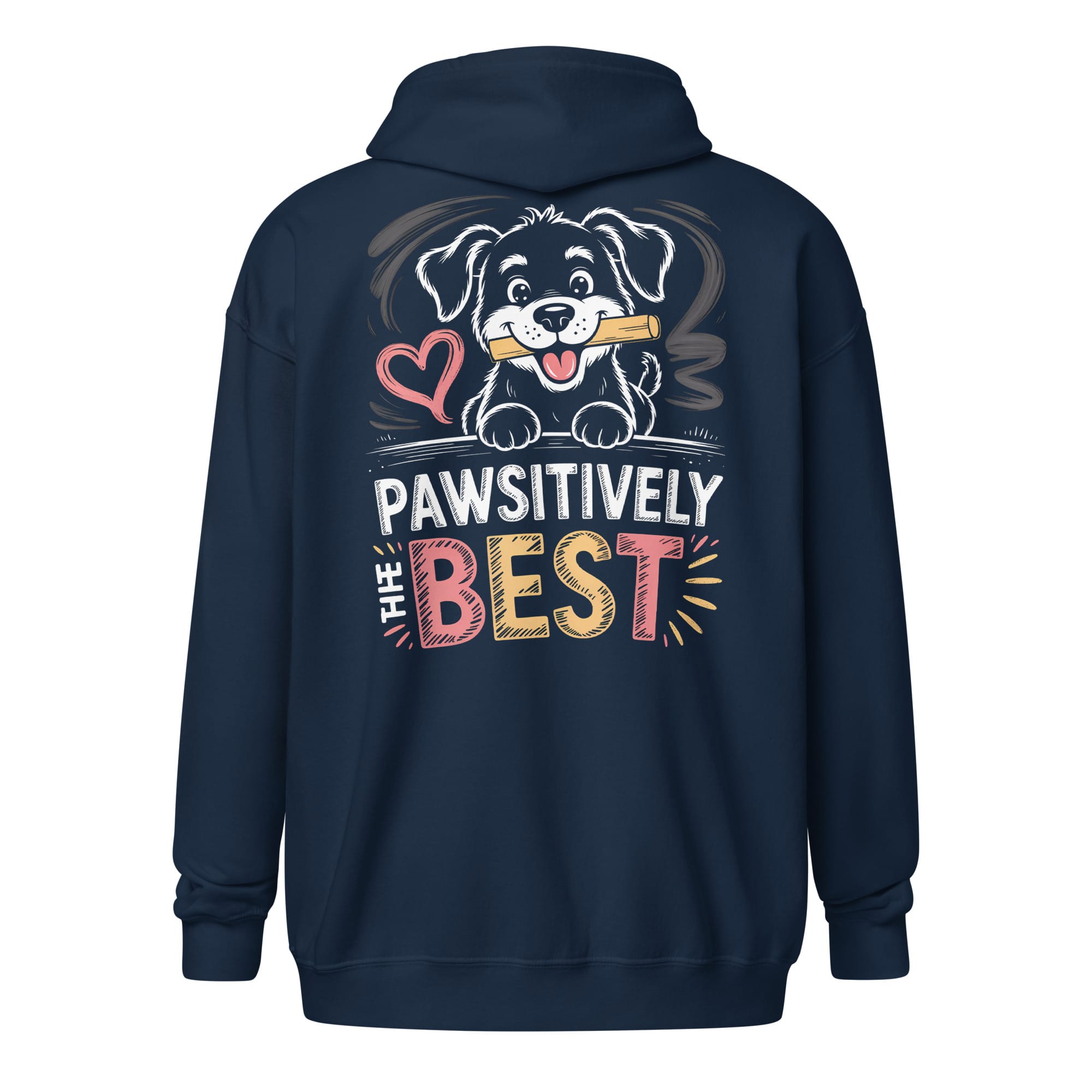 Meet your new favorite layering piece! This zip hoodie combines ultimate comfort with a delightful surprise. With a clean, classic look from the front, it’s perfect for any occasion. But the back tells the real story, featuring our adorable “Pawsitively The Best” dog design that proudly showcases your love for your furry friend.