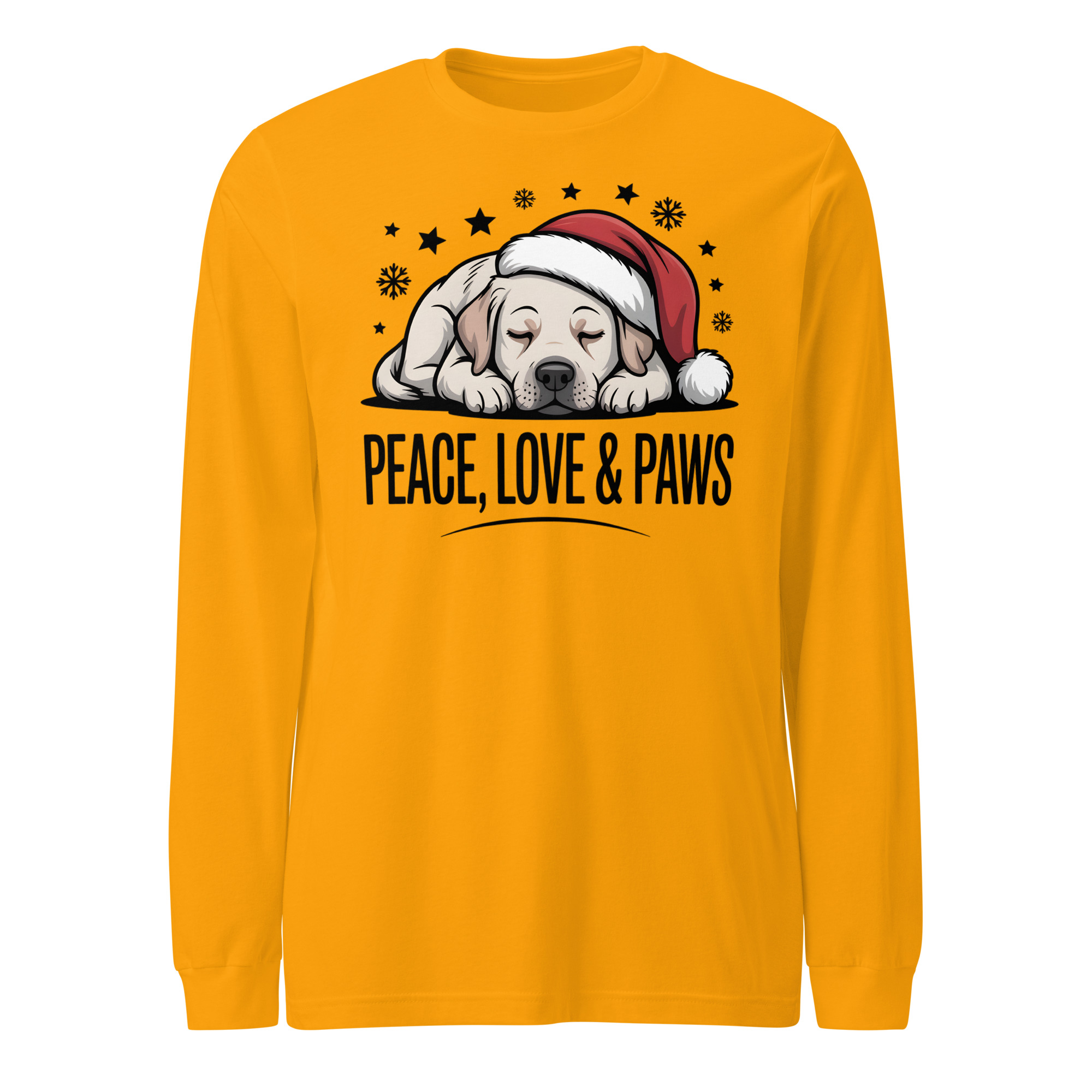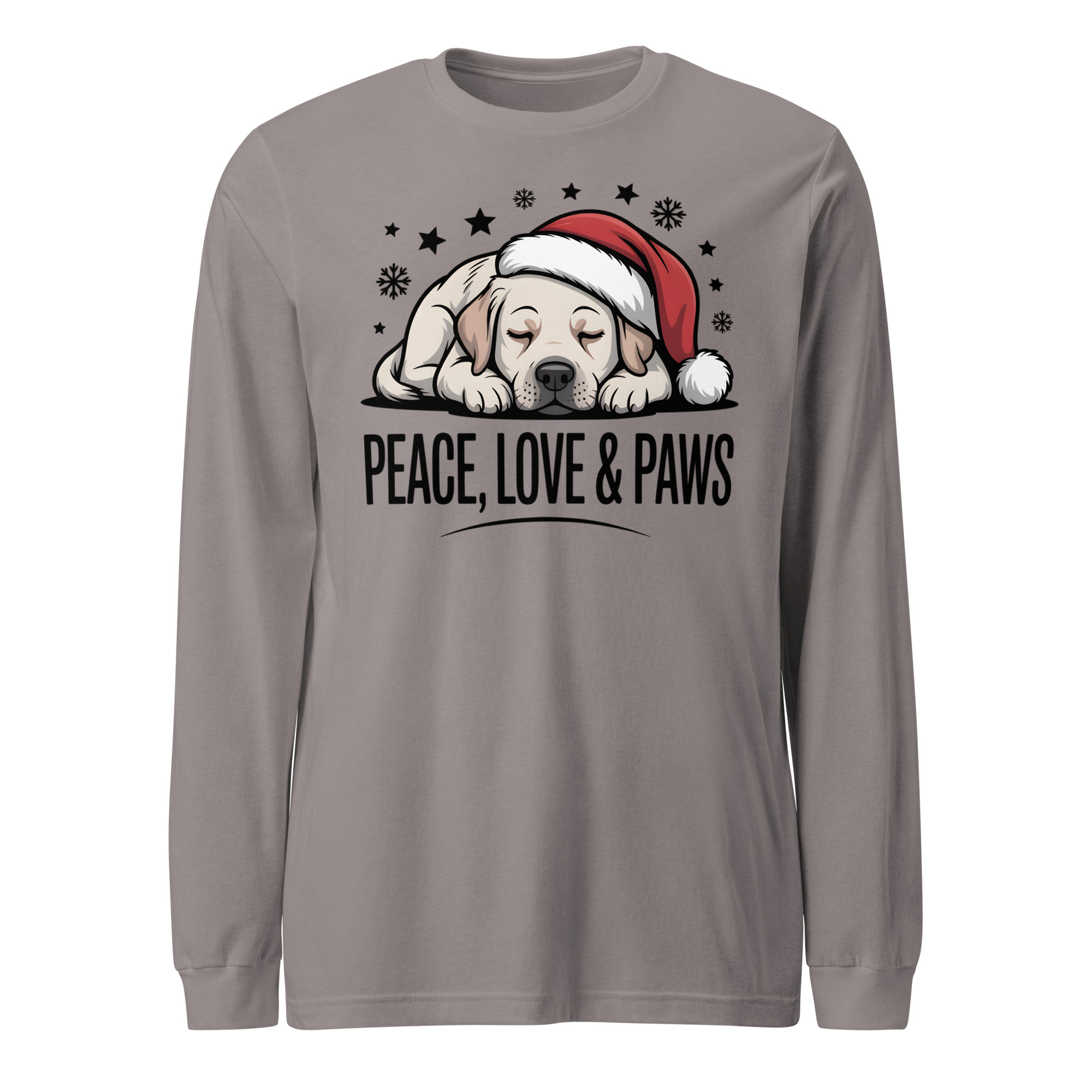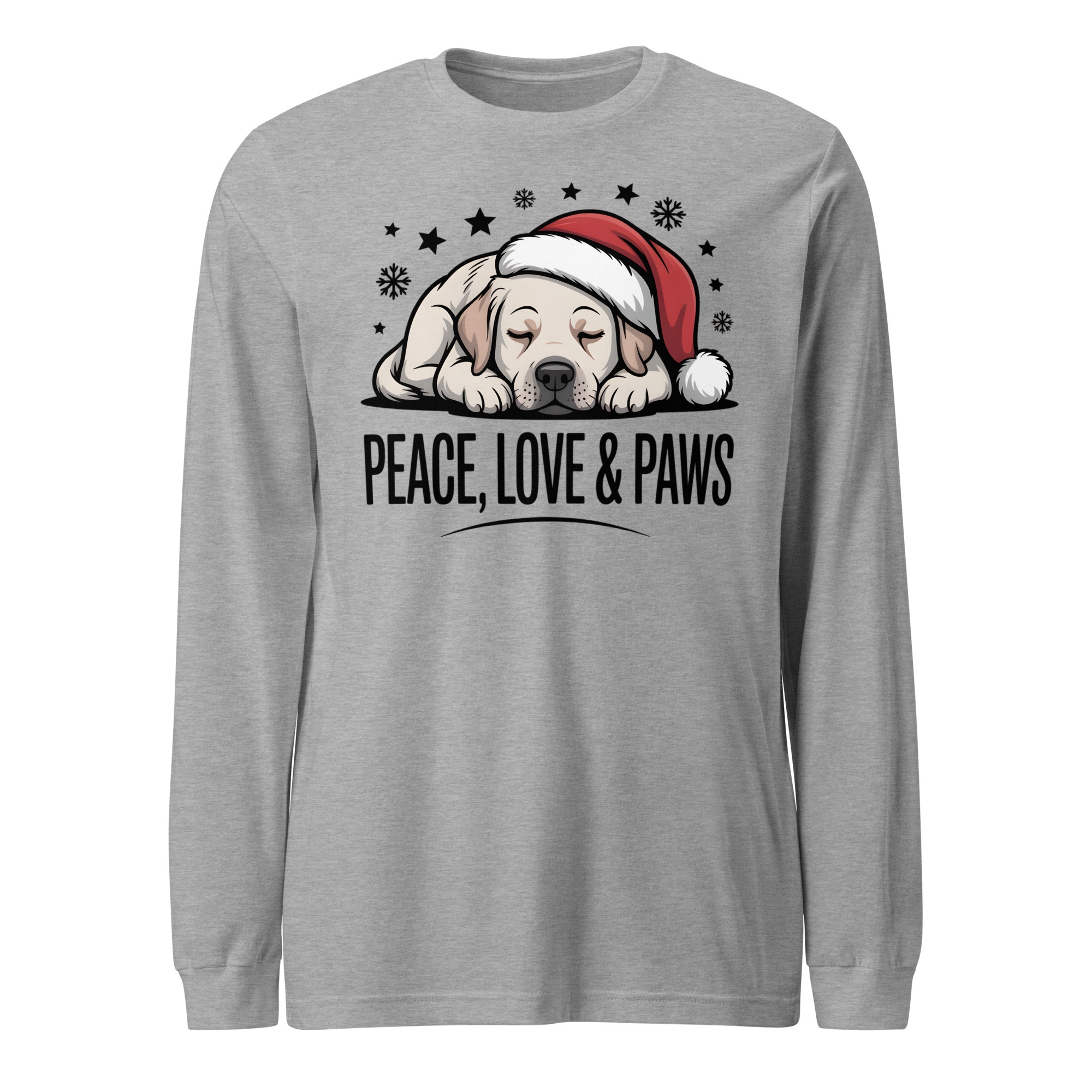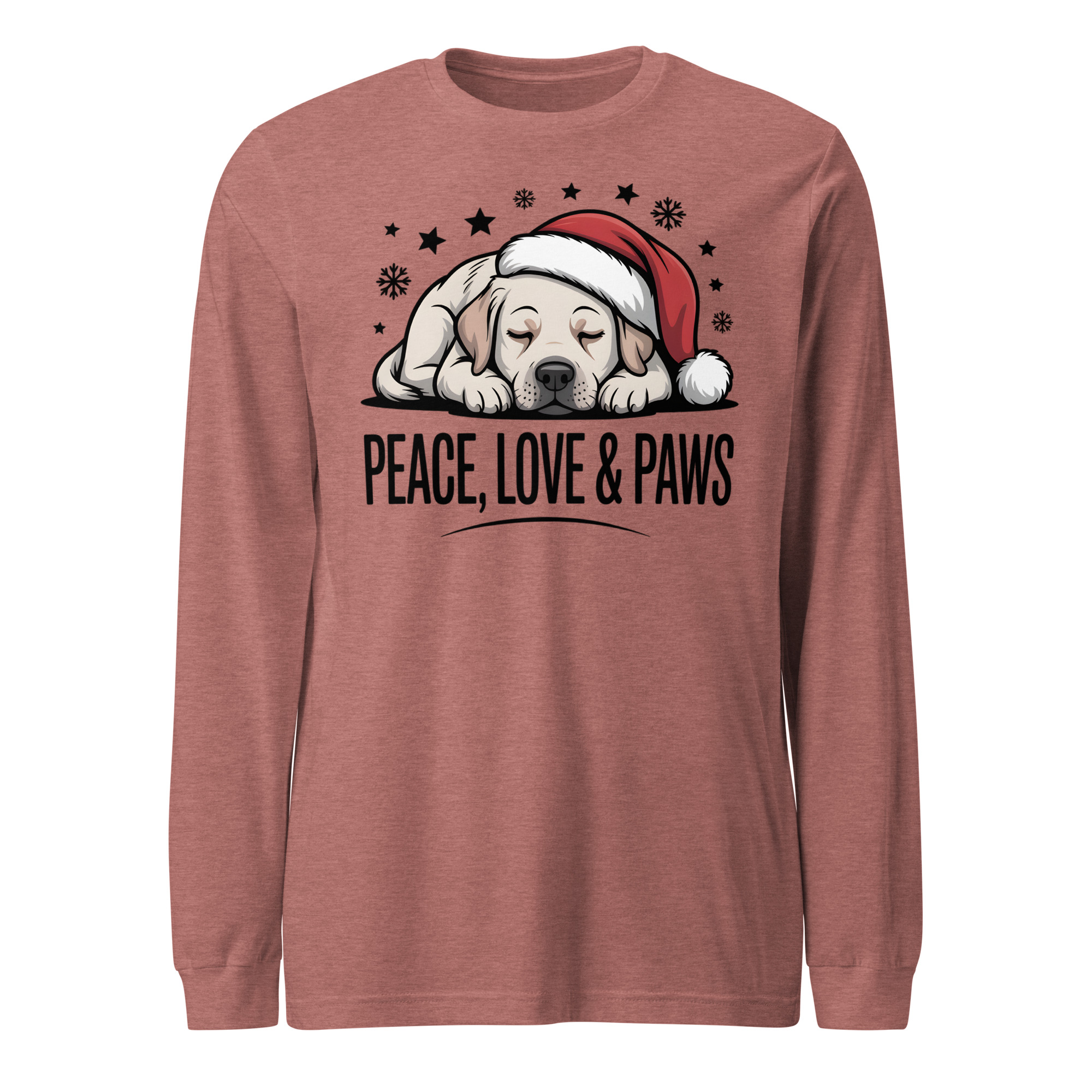 Embrace the holiday spirit with this soft and charming Unisex Long Sleeve Tee! It features the heartwarming graphic of a sweet, sleeping puppy in a Santa hat and the lovely message “PEACE, LOVE & PAWS.” It’s an ideal choice for a casual look, perfect for wearing on its own or layering under a vest or jacket during the cooler seasons.